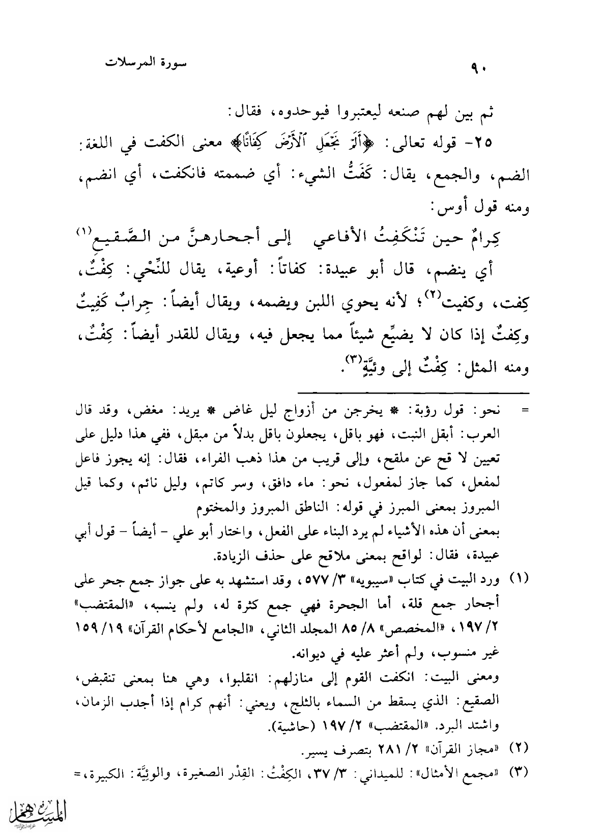 25 - قوله تعالى: {أَلَمْ نَجْعَلِ الْأَرْضَ كِفَاتًا} معنى الكفت في اللغة: الضم، والجمع، يقال: كَفَتُّ الشيء: أي ضممته فانكفت، أي انضم، ومنه قول أوس: