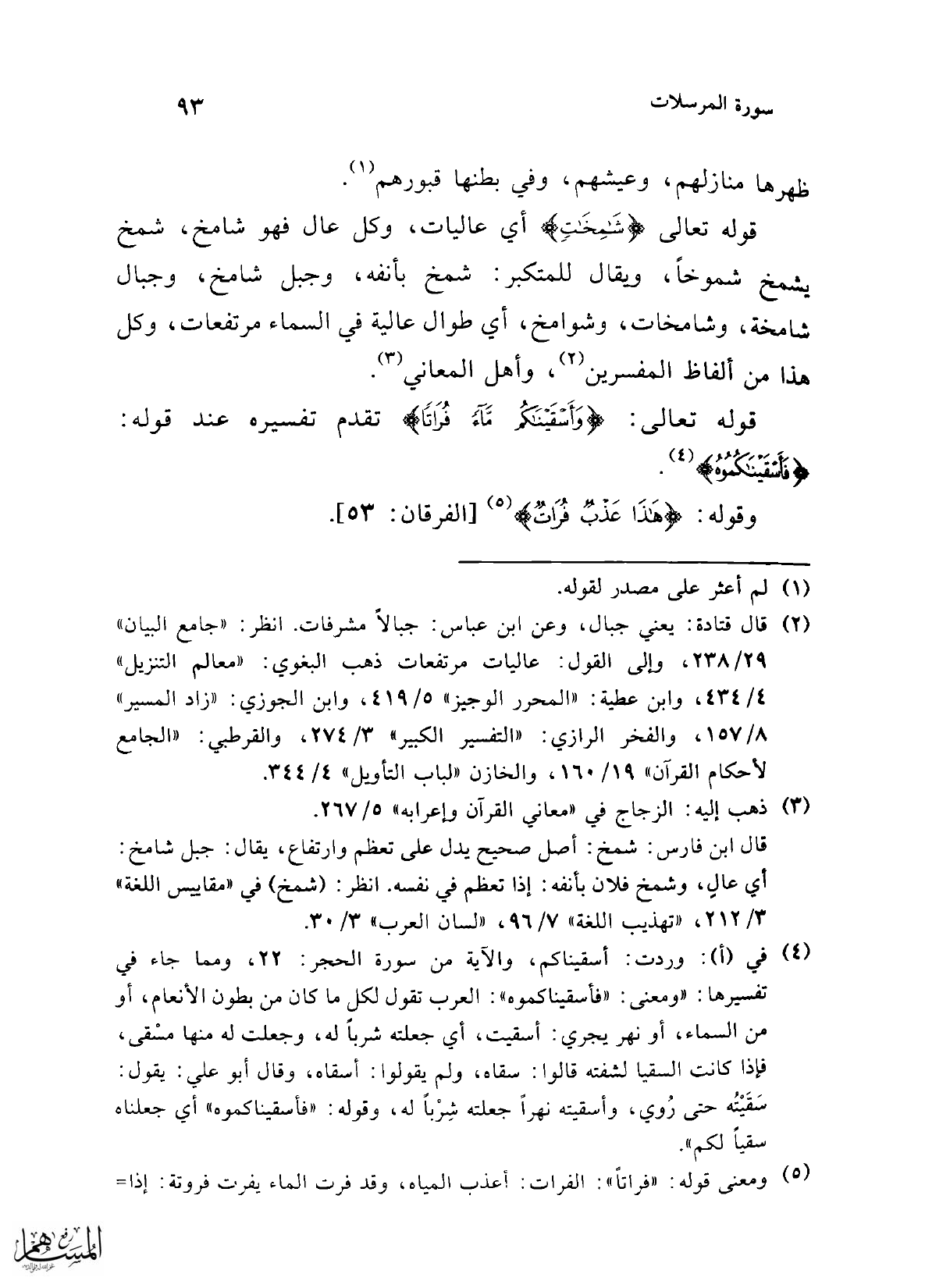 قوله تعالى {شَامِخَاتٍ} أي عاليات، وكل عال فهو شامخ، شمخ يشمخ شموخاً، ويقال للمتكبر: شمخ بأنفه، وجبل شامخ، وجبال شامخة، وشامخات، وشوامخ، أي طوال عالية في السماء مرتفعات، وكل هذا من ألفاظ المفسرين (¬2)، وأهل المعاني (¬3).