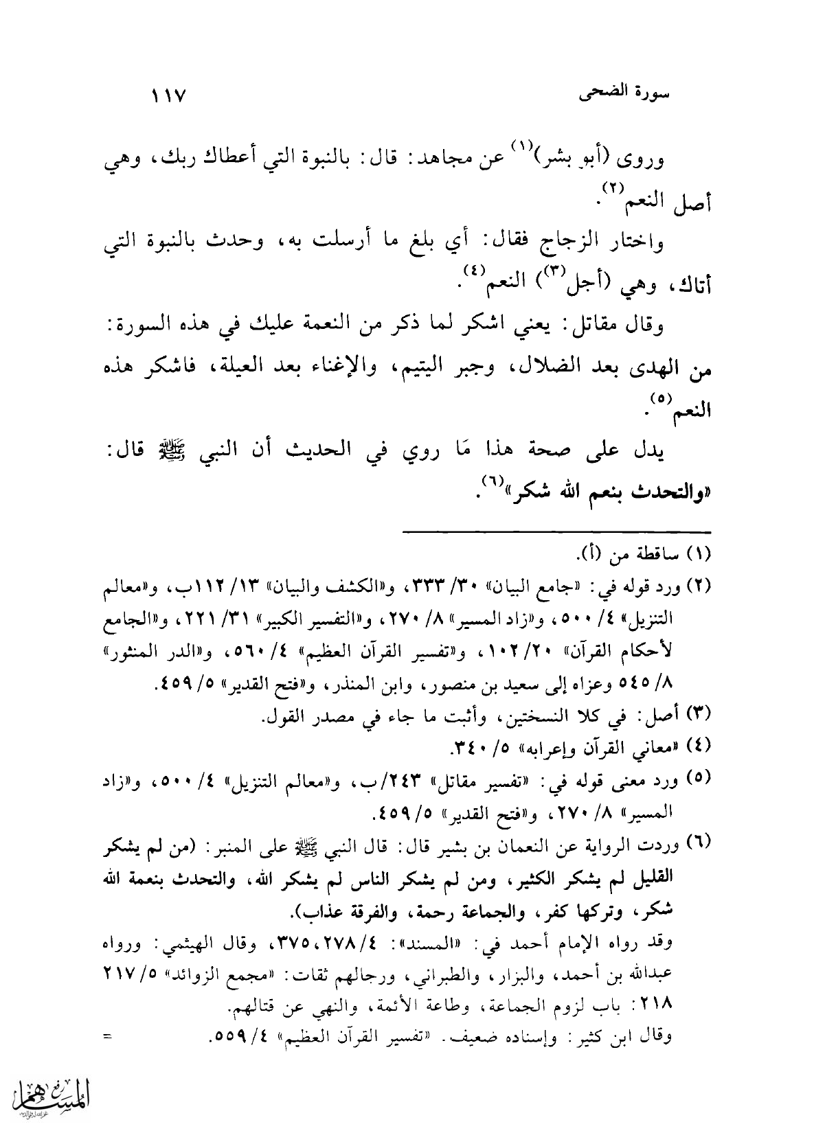 وقال مقاتل: يعني اشكر لما ذكر من النعمة عليك في هذه السورة: من الهدى بعد الضلال، وجبر اليتيم، والإغناء بعد العيلة، فاشكر هذه النعم (¬5).