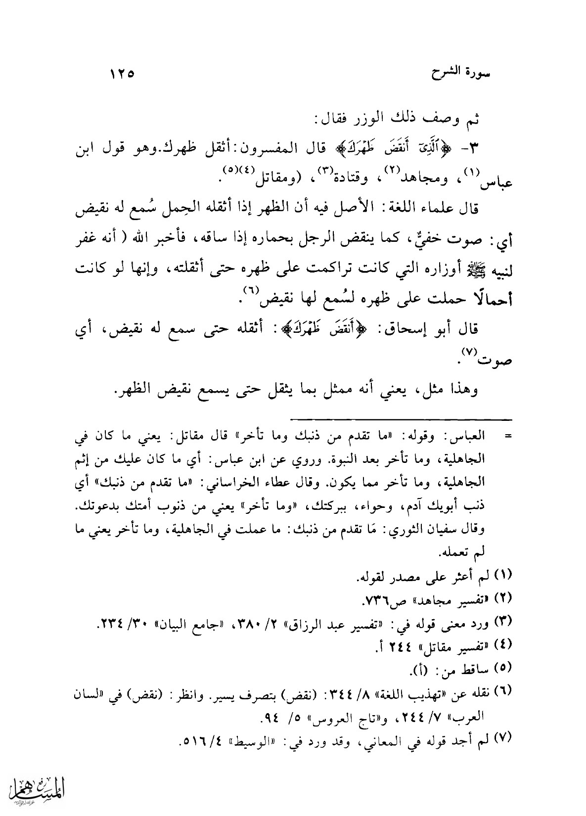 3 - {الَّذِي أَنْقَضَ ظَهْرَكَ} قال المفسرون: أثقل ظهرك. وهو قول ابن عباس (¬1)، ومجاهد (¬2)، وقتادة (¬3)، (ومقاتل (¬4) (¬5).