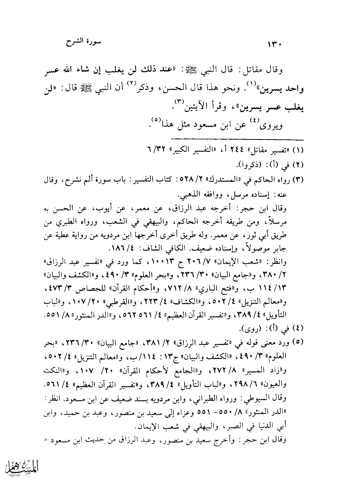 (¬3) رواه الحاكم في "المستدرك" 2/ 528: كتاب التفسير: باب سورة ألم نشرح، وقال عنه: إسناده مرسل، ووافقه الذهبي.