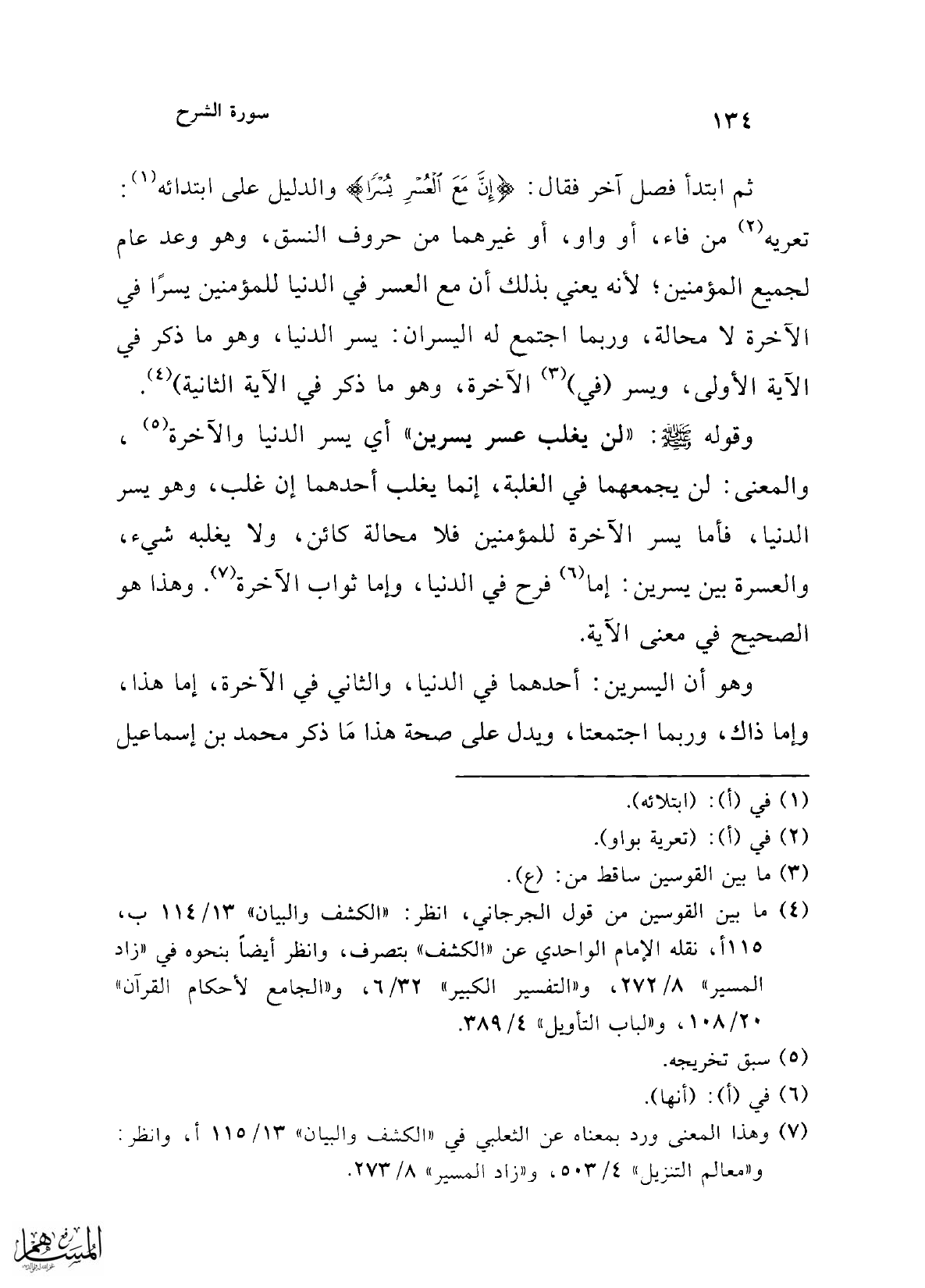 (¬4) ما بين القوسين من قول الجرجاني، انظر: "الكشف والبيان" 13/ 114 ب، 115 أ، نقله الإمام الواحدي عن "الكشف" بتصرف، وانظر أيضًا بنحوه في "زاد المسير" 8/ 272، و"التفسير الكبير" 32/ 6، و"الجامع لأحكام القرآن" 20/ 108، و"لباب التأويل" 4/ 389.