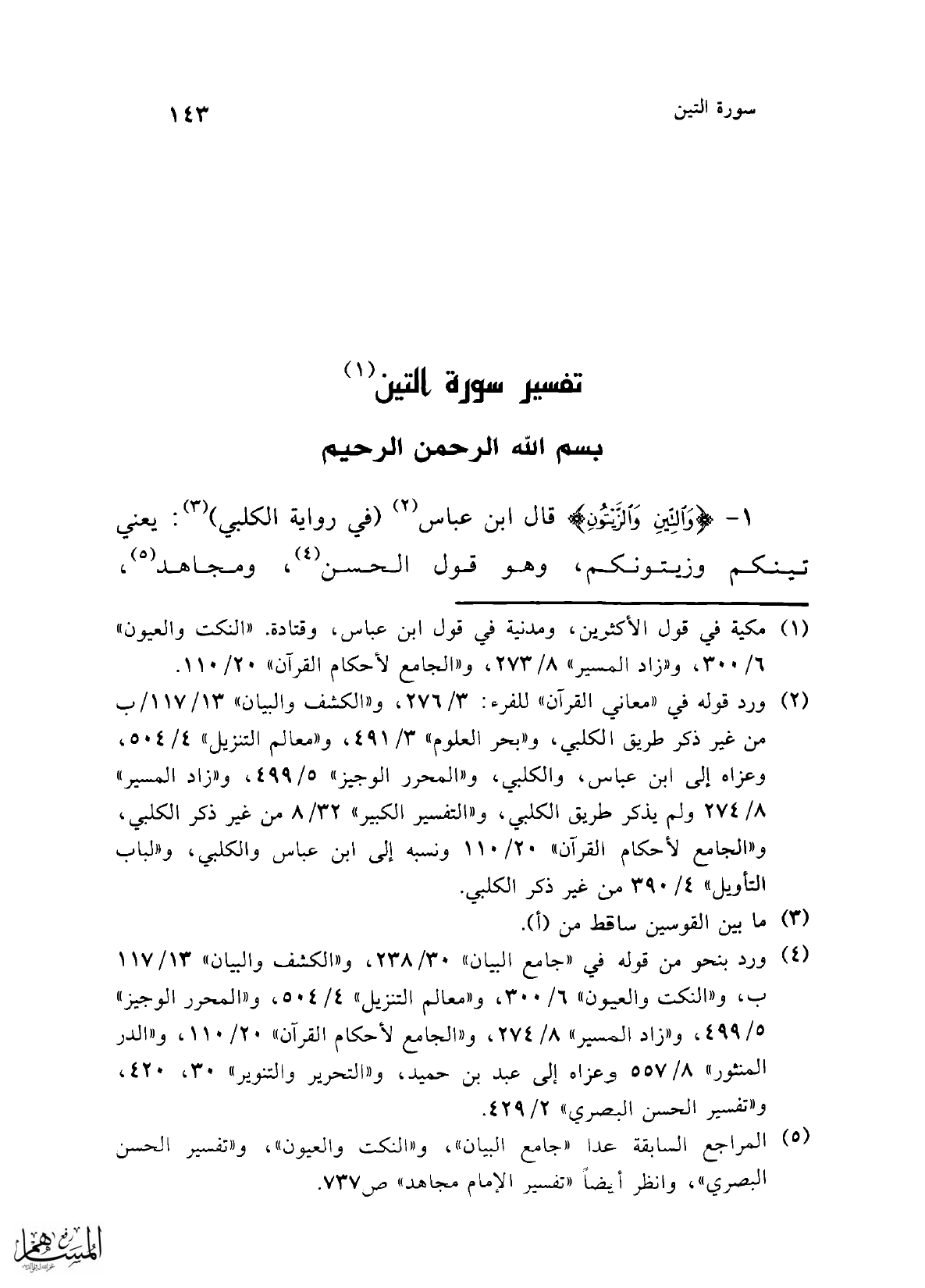 1 - {وَالتِّينِ وَالزَّيْتُونِ} وقال ابن عباس (¬2) (في رواية الكلبي) (¬3): يعني تينكم وزيتونكم، وهو قول الحسن (¬4)، ومجاهد (¬5)،