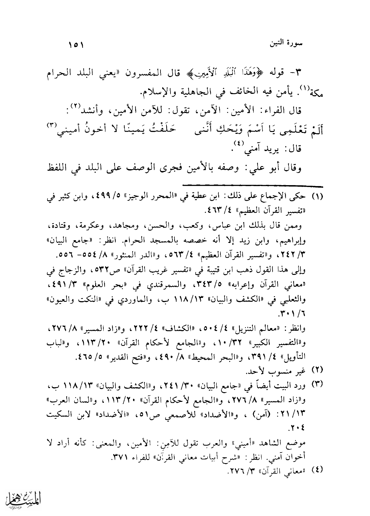 3 - قوله {وَهَذَا الْبَلَدِ الْأَمِينِ} قال المفسرون "يعني البلد الحرام مكة (¬1). يأمن فيه الخائف في الجاهلية والإسلام.