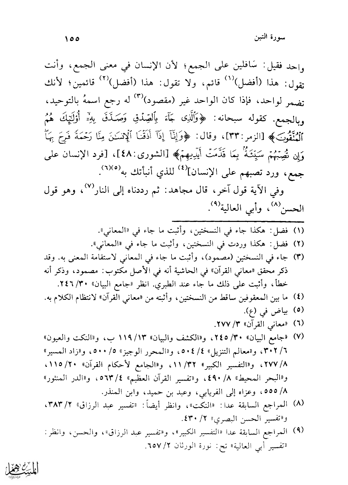واحد فقيل: سَافلين عى الجمع؛ لأن الإنسان في معنى الجمع، وأنت يقول: هذا (أفضل) (¬1) قائم، ولا تقول: هذا (أفضل) (¬2) قائمين؛ لأنك تضمر لواحد، فإذا كان الواحد غير (مقصود) (¬3) له رجع اسمهُ بالتوحيد، وبالجمع. كقوله سبحانه: {وَالَّذِي جَاءَ بِالصِّدْقِ وَصَدَّقَ بِهِ أُولَئِكَ هُمُ الْمُتَّقُونَ} [الزمر: 33]، وقال: {وَإِنَّا إِذَا أَذَقْنَا الْإِنْسَانَ مِنَّا رَحْمَةً فَرِحَ بِهَا وَإِنْ تُصِبْهُمْ سَيِّئَةٌ بِمَا قَدَّمَتْ أَيْدِيهِمْ} [الشورى: 48]، [فرد الإنسان على جمع، ورد تصبهم على الإنسان] (¬4) للذي أنبأتك به (¬5) (¬6).