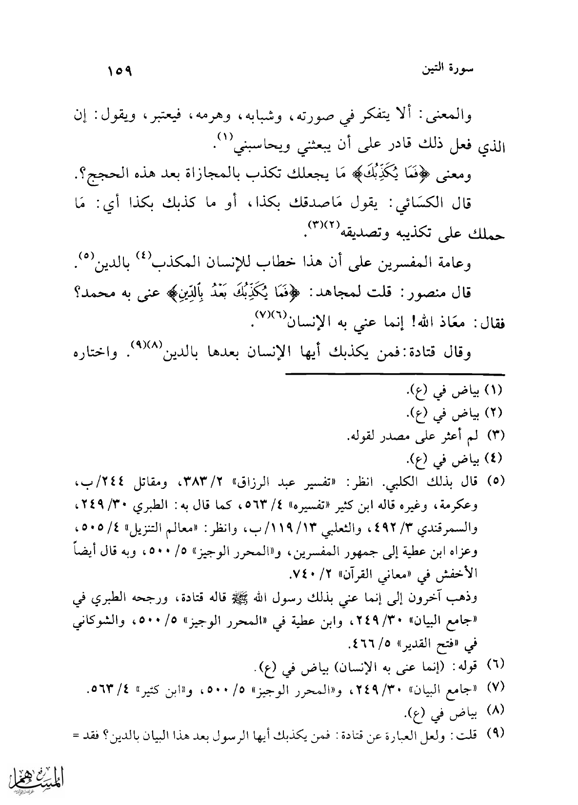 قال منصور: قلت لمجاهد: {فَمَا يُكَذِّبُكَ بَعْدُ بِالدِّينِ} عني به محمد؟ فقال: معَاذ الله! إنما عني به الإنسان (¬6) (¬7).