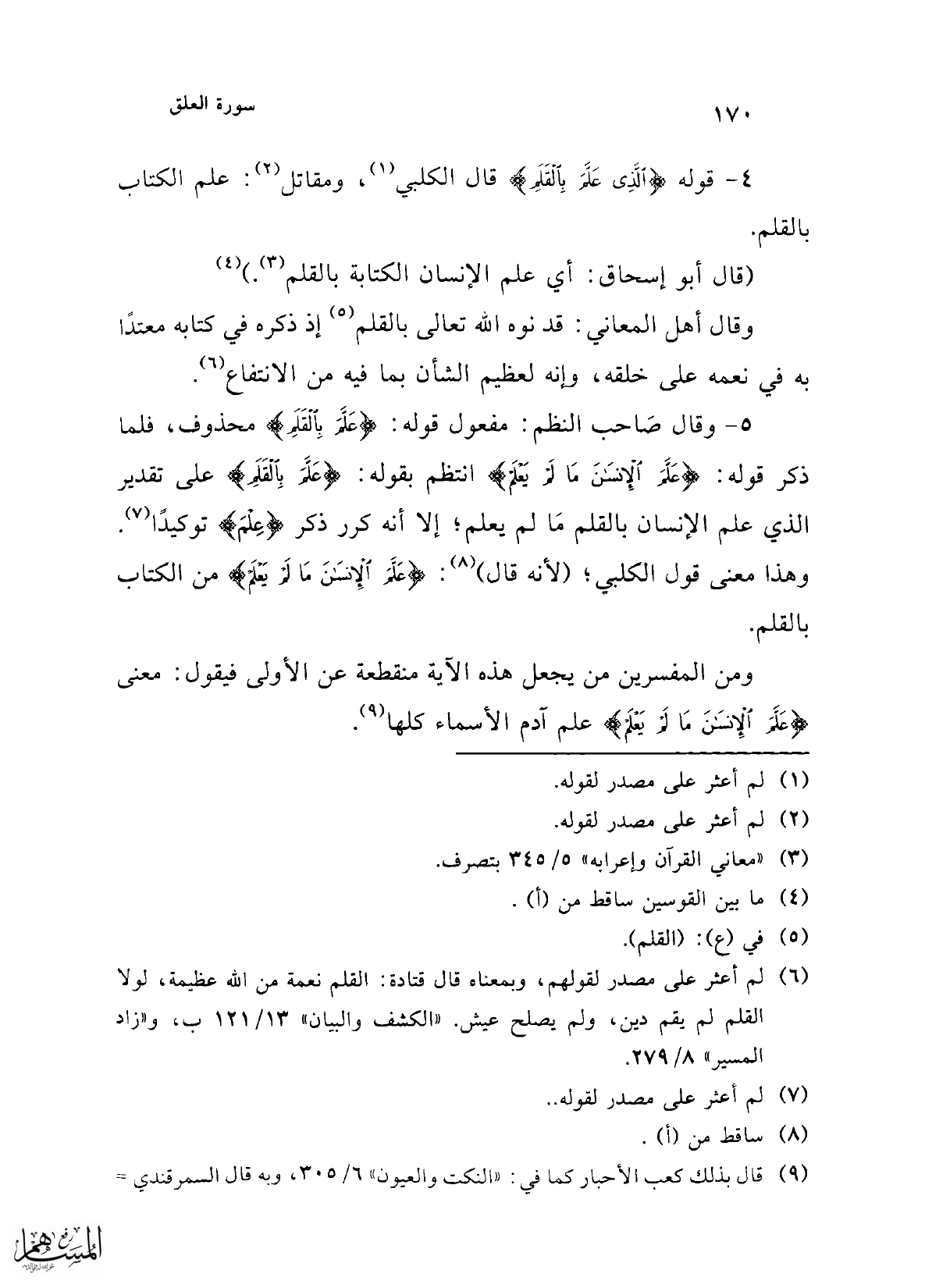 5 - وقال صَاحب النظم: مفعول قوله: {عَلَّمَ بِالْقَلَمِ} محذوف، فلما ذكر قوله: {عَلَّمَ الْإِنْسَانَ مَا لَمْ يَعْلَمْ} انتظم بقوله: {عَلَّمَ بِالْقَلَمِ} على تقدير الذي علم الإنسان بالقلم مَا لم يعلم؛ إلا أنه كرر ذكر {عَلَّمَ} توكيدًا (¬7). وهذا معنى قول الكلبي؛ (لأنه قال) (¬8): {عَلَّمَ الْإِنْسَانَ مَا لَمْ يَعْلَمْ} من الكتاب بالقلم.