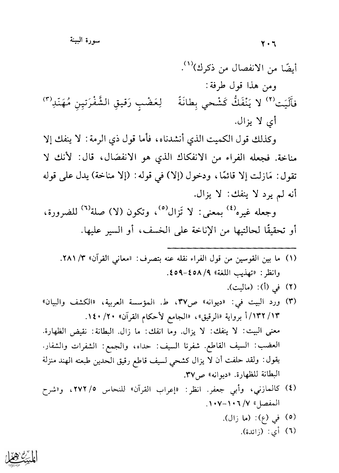 وكذلك قول الكميت الذي أنشدناه، فأما قول ذي الرمة: لا ينفك إلا مناخة. فجعله الفراء من الانفكاك الذي هو الانفصَال، قال: لأنك لا تقول: مَازلت إلا قائمًا، ودخول (إلا) في قوله: (إلا مناخة) يدل على قوله أنه لم يرد لا ينفك: لا يزال.