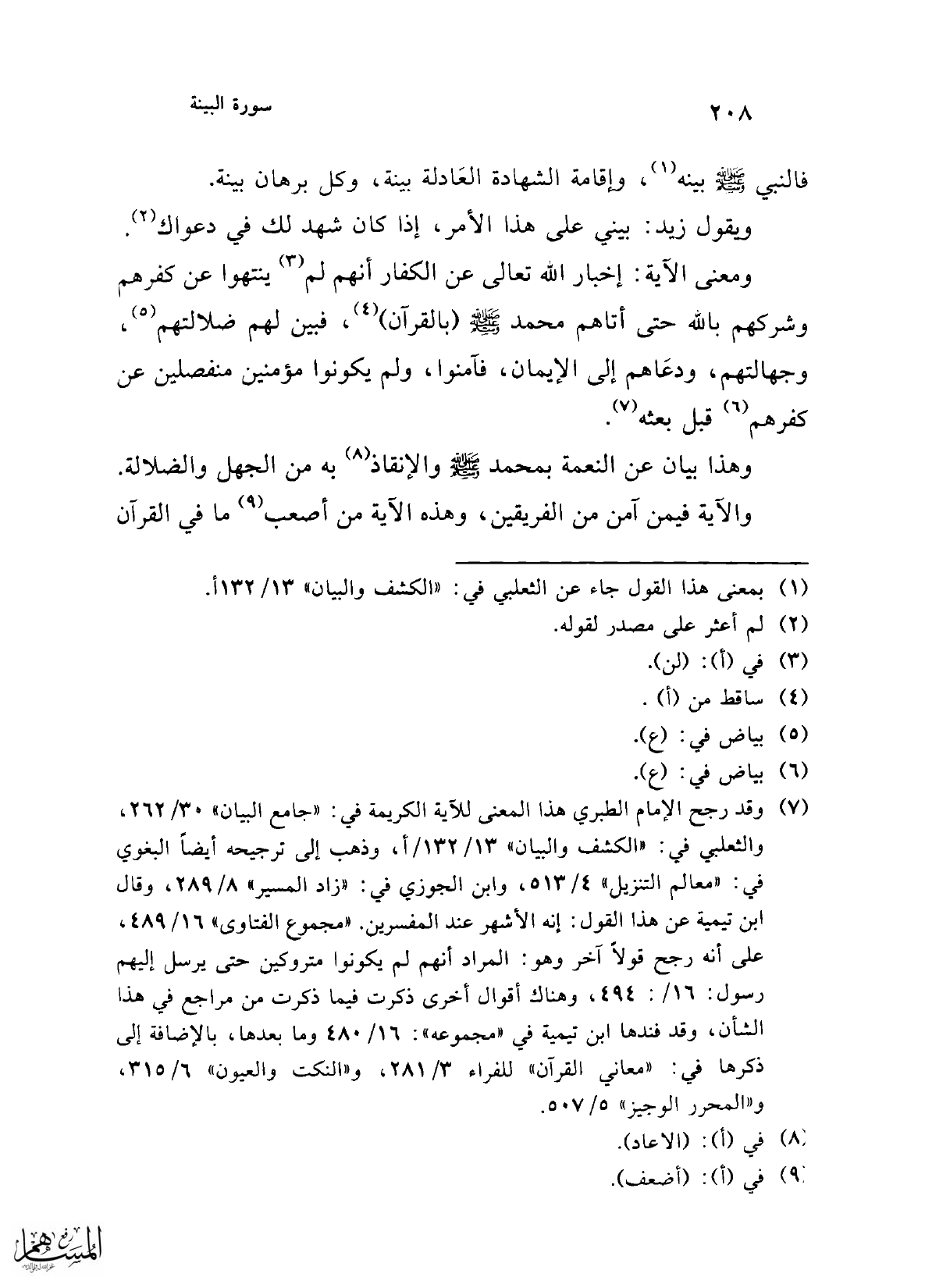 ومعنى الآية: إخبار الله تعالى عن الكفار أنهم لم (¬3) ينتهوا عن كفرهم وشركهم بالله حتى أتاهم محمد -صلى الله عليه وسلم- (بالقرآن) (¬4)، فبين لهم ضلالتهم (¬5)، وجهالتهم، ودعَاهم إلى الإيمان" فآمنوا، ولم يكونوا مؤمنين منفصلين عن كفرهم (¬6) قبل بعثه (¬7).