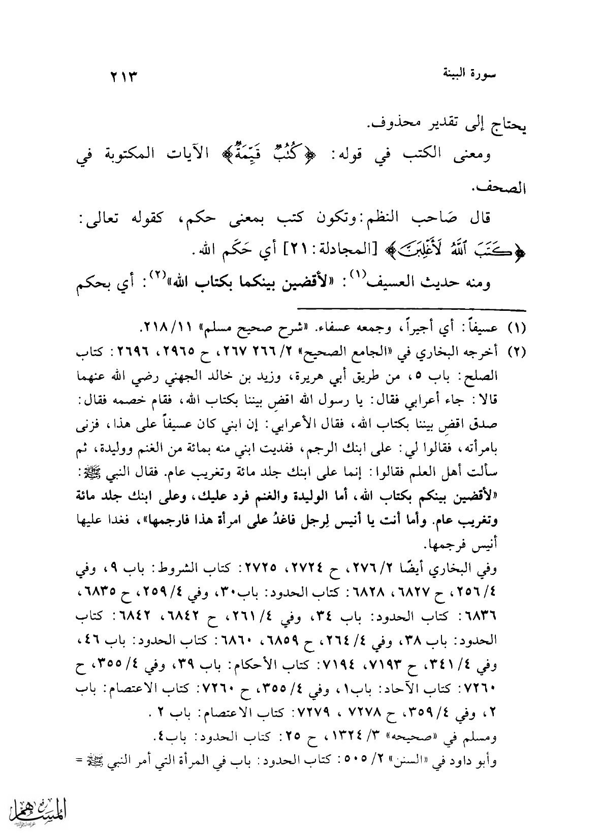 (¬2) أخرجه البخاري في "الجامع الصحيح" 2/ 266 - 267، ح 2965، 2696: كتاب الصلح: باب 5، من طريق أبي هريرة، وزيد بن خالد الجهني رضي الله عنهما قالا: جاء أعرابي فقال: يا رسول الله اقضِ بيننا بكتاب الله، فقام خصمه فقال: صدق اقضِ بيننا بكتاب الله، فقال الأعرابي: إن ابني كان عسيفاً على هذا، فزنى بامرأته، فقالوا لي: على ابنك الرجم، ففديت ابني منه بمائة من الغنم ووليدة، ثم سألت أهل العلم فقالوا: إنما على ابنك جلد مائة وتغريب عام. فقال النبي -صلى الله عليه وسلم-: "لأقضين بينكم بكتاب الله، أما الوليدة والغنم فرد عليك، وعلى ابنك جلد مائة وتغريب عام. وأما أنت يا أنيس لِرجل فاغدُ على امرأة هذا فارجمها"، فغدا عليها أنيس فرجمها.