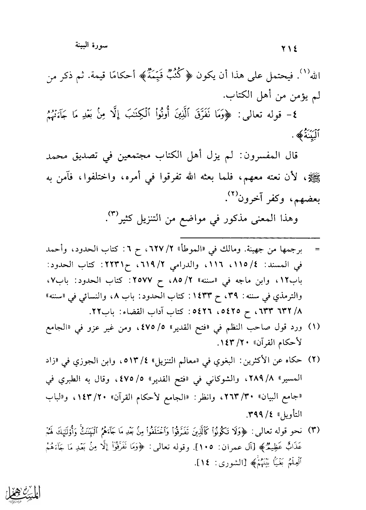 الله (¬1). فيحتمل على هذا أن يكون {كُتُبٌ قَيِّمَةٌ} أحكامًا قيمة. ثم ذكر من لم يؤمن من أهل الكتاب.