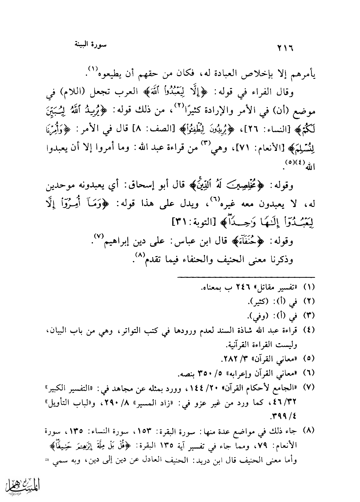 (¬8) جاء ذلك في مواضع عدة منها: سورة البقرة: 153، سورة النساء: 135، سورة الأنعام: 79، ومما جاء في تفسير آية 135 البقرة: {قُلْ بَلْ مِلَّةَ إِبْرَاهِيمَ حَنِيفًا} وأما معنى الحنيف قال ابن دريد: الحنيف العادل عن دين إلى دين، وبه سمي =