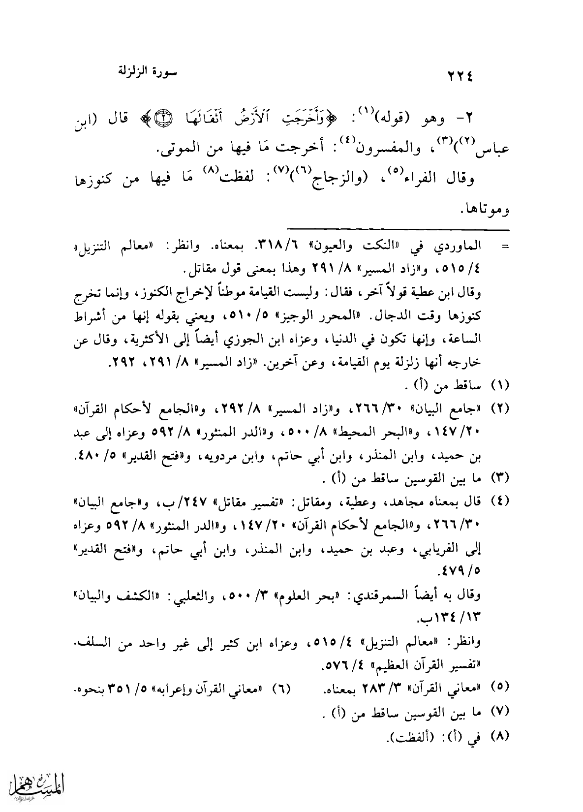 2 - وهو (قوله) (1): {وَأَخْرَجَتِ الْأَرْضُ أَثْقَالَهَا (2)} قال ابن عباس (2)) (3)، والمفسرون (4): أخرجت مَا فيها من الموتى.