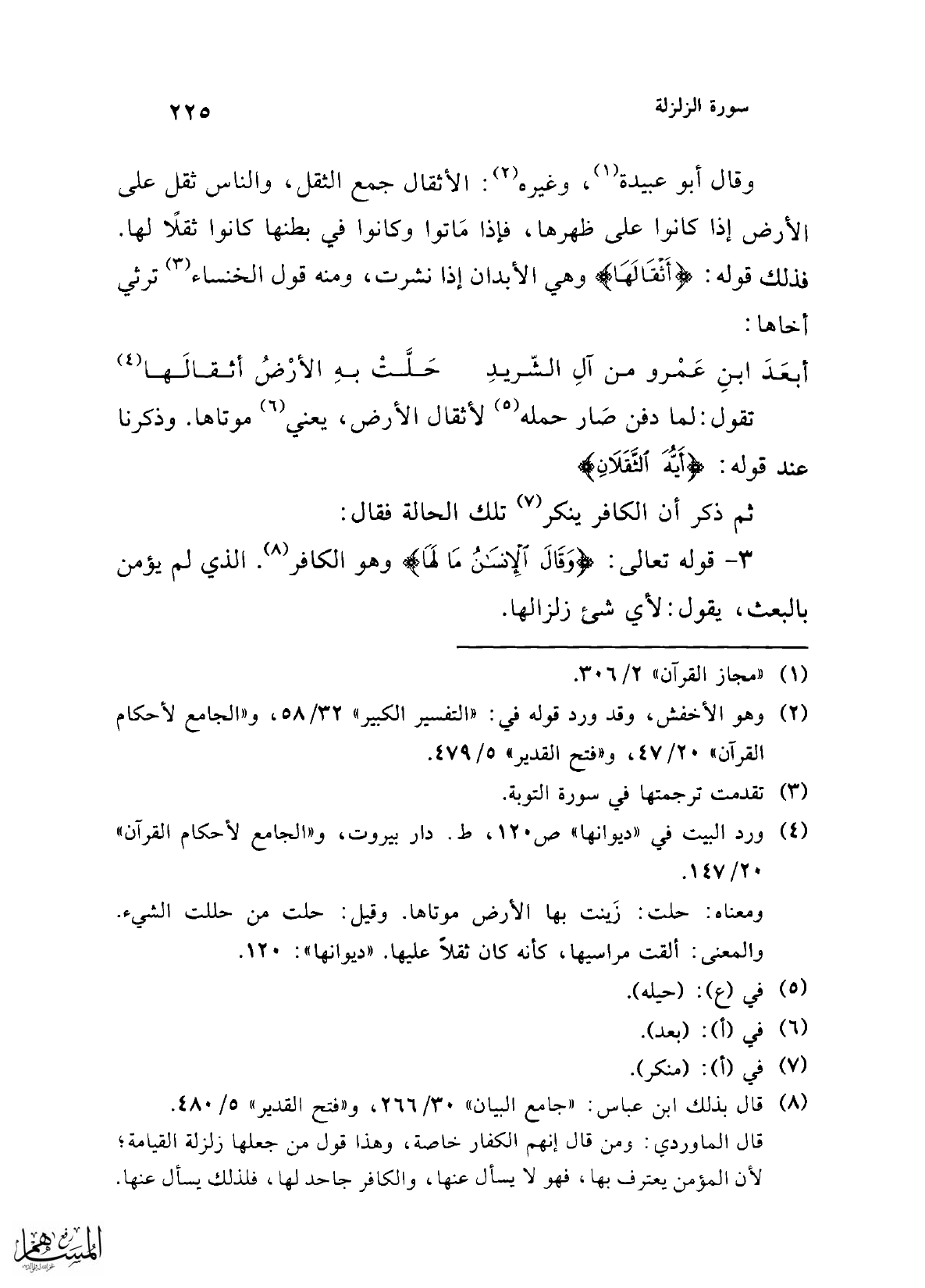 (¬2) وهو الأخفش، وقد ورد قوله في: "التفسير الكبير" 32/ 58، و"الجامع لأحكام القرآن" 20/ 47، و"فتح القدير" 5/ 479.