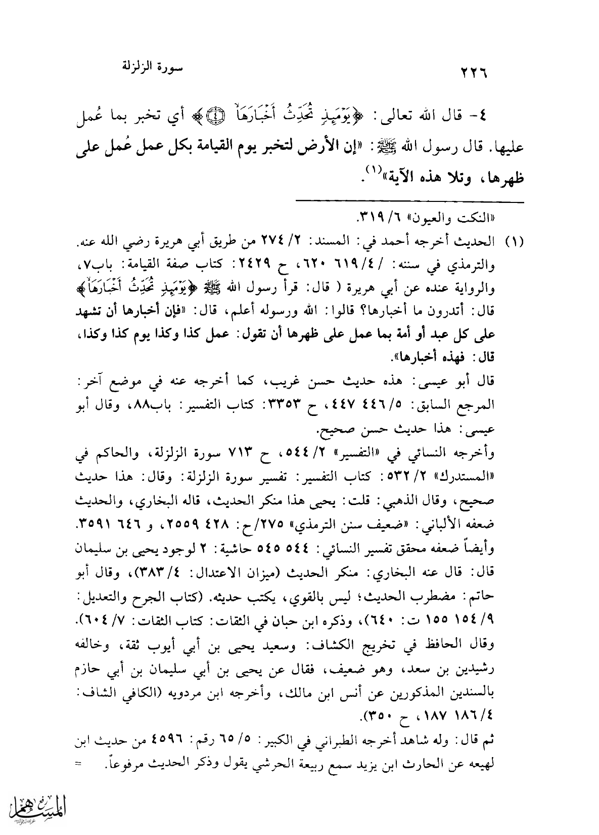 4 - قال الله تعالى: {يَوْمَئِذٍ تُحَدِّثُ أَخْبَارَهَا (4)} أي تخبر بما عُمل عليها. قال رسول الله -صلى الله عليه وسلم-: "إن الأرض لتخبر يوم القيامة بكل عمل عُمل على ظهرها، وتلا هذه الآية" (¬1).