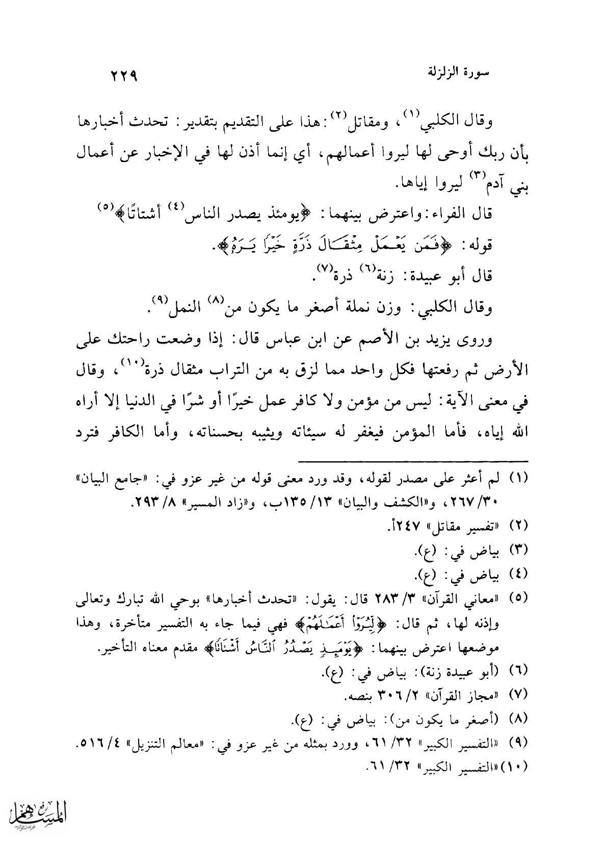 (¬5) "معاني القرآن" 3/ 283 قال: يقول: "تحدث أخبارها" بوحي الله تبارك وتعالى وإذنه لها، ثم قال: {لِيُرَوْا أَعْمَالَهُمْ} فهي فيما جاء به التفسير متأخرة، وهذا موضعها اعترض بينهما: {يَوْمَئِذٍ يَصْدُرُ النَّاسُ أَشْتَاتًا} مقدم معناه التأخير.
