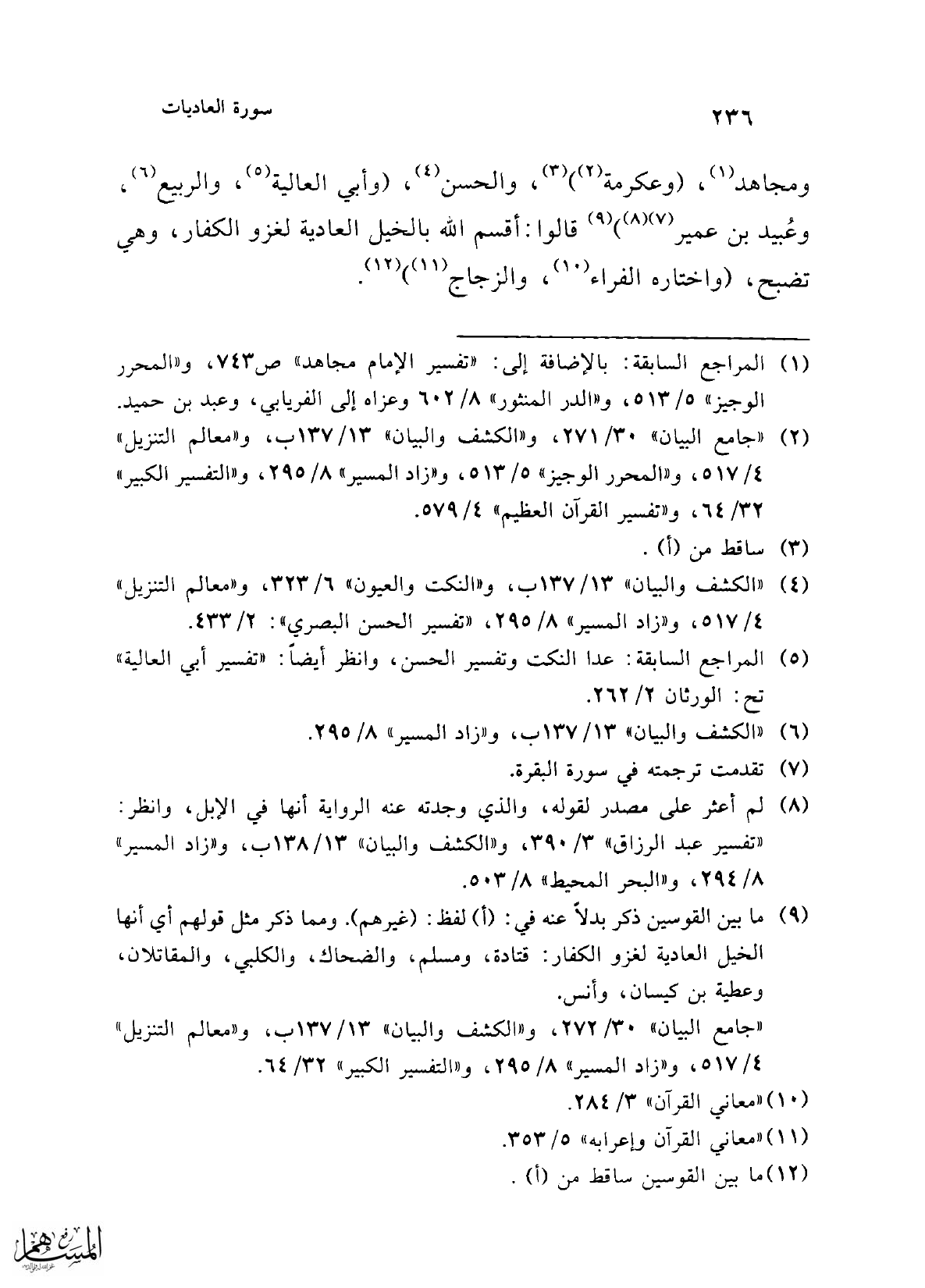 (¬1) المراجع السابقة: بالإضافة إلى: "تفسير الإمام مجاهد" 743، و"المحرر الوجيز" 5/ 513، و"الدر المنثور" 8/ 602 وعزاه إلى الفريابي، وعبد بن حميد.