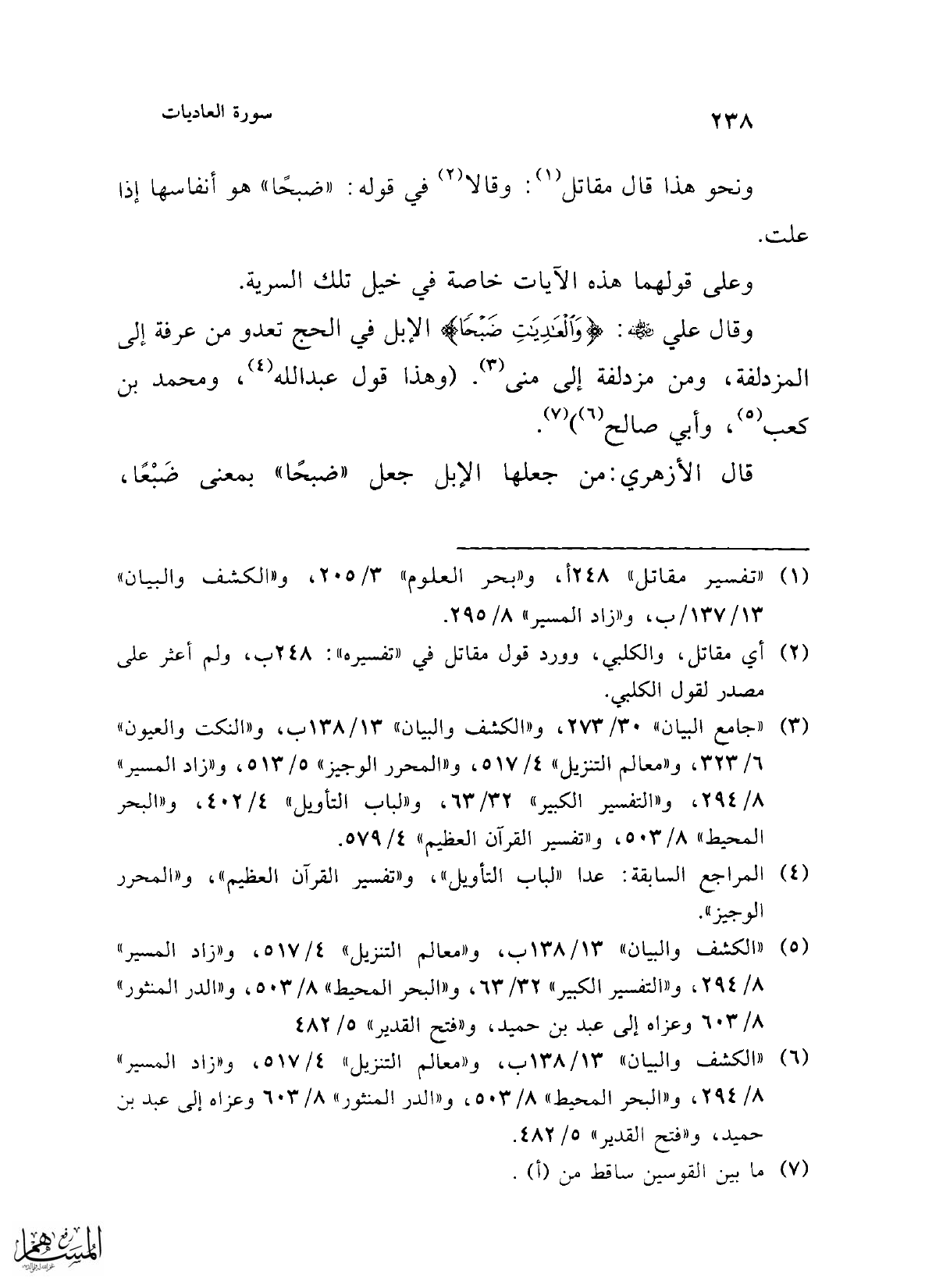 وقال علي -رضي الله عنه-: {وَالْعَادِيَاتِ ضَبْحًا} الإبل في الحج تعدو من عرفة إلى المزدلفة، ومن مزدلفة إلى مني (¬3). (وهذا قول عبد الله (¬4)، ومحمد بن كعب (¬5)، وأبي صالح (¬6)) (¬7).