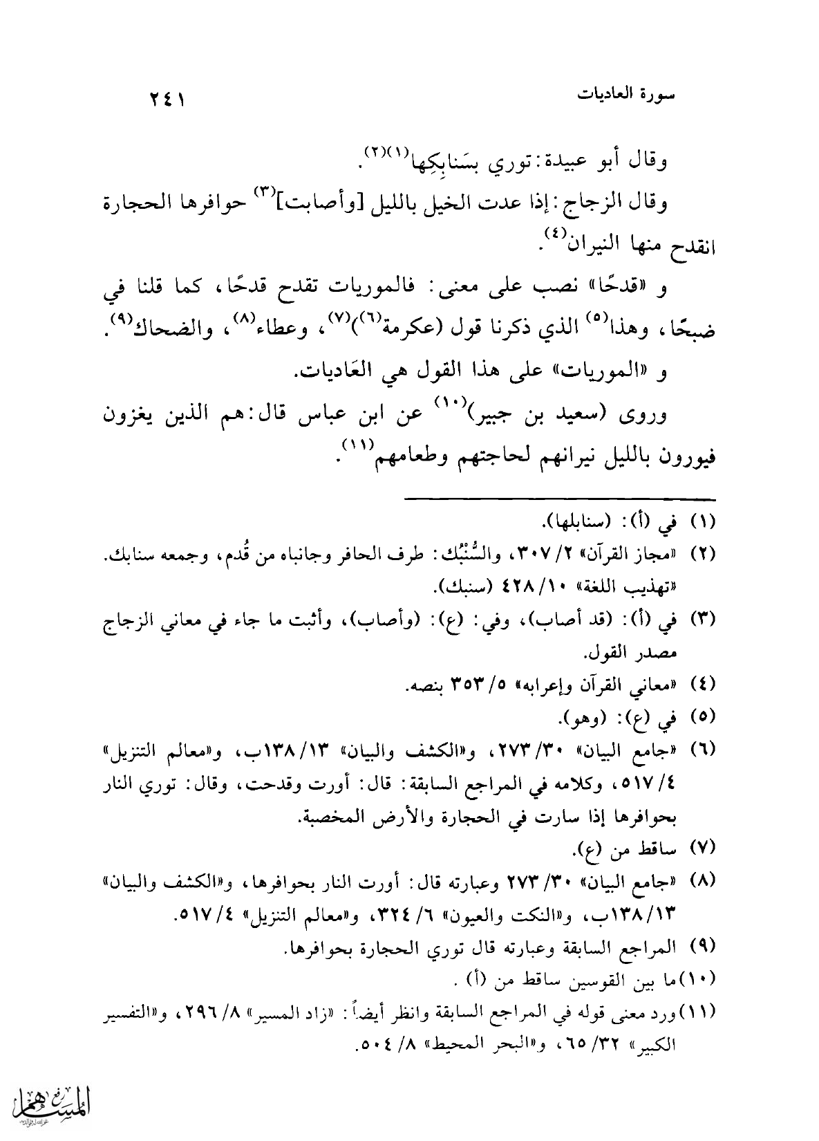 (¬8) "جامع البيان" 30/ 273 وعبارته قال: أورت النار بحوافرها، و"الكشف والبيان" 13/ 138 ب، و"النكت والعيون" 6/ 324، و"معالم التنزيل" 4/ 517.
