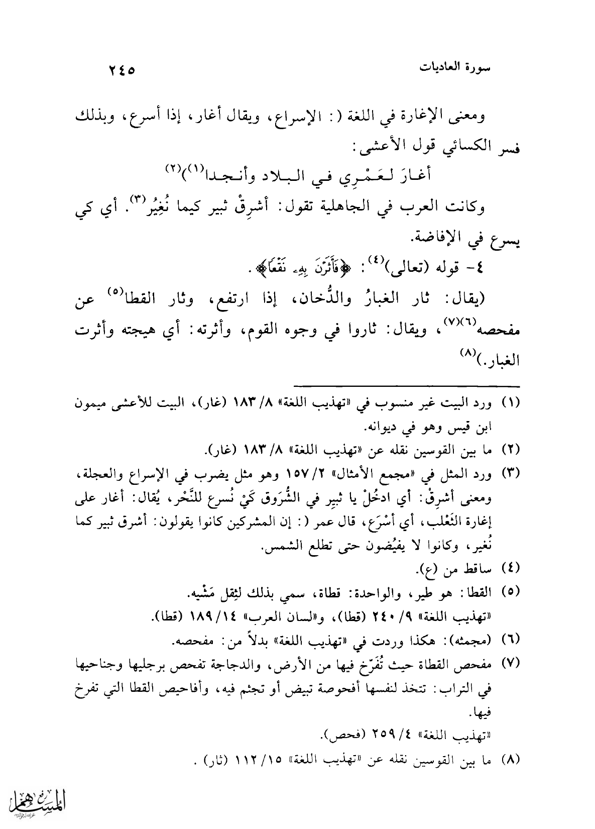 (¬3) ورد المثل في "مجمع الأمثال" 2/ 157 وهو مثل يضرب في الإسراع والعجلة، ومعنى أشرِقْ: أي ادخُلْ يا ثبيِر في الشُّرَوق كَي نُسرع للنَّحْر، يُقال: أغار على إغارة الثَعْلب، أي أسْرَع، قال عمر): إن المشركين كانوا يقولون: أشرق ثبير كما نُغير، وكانوا لا يفيُضون حتى تطلع الشمس.
