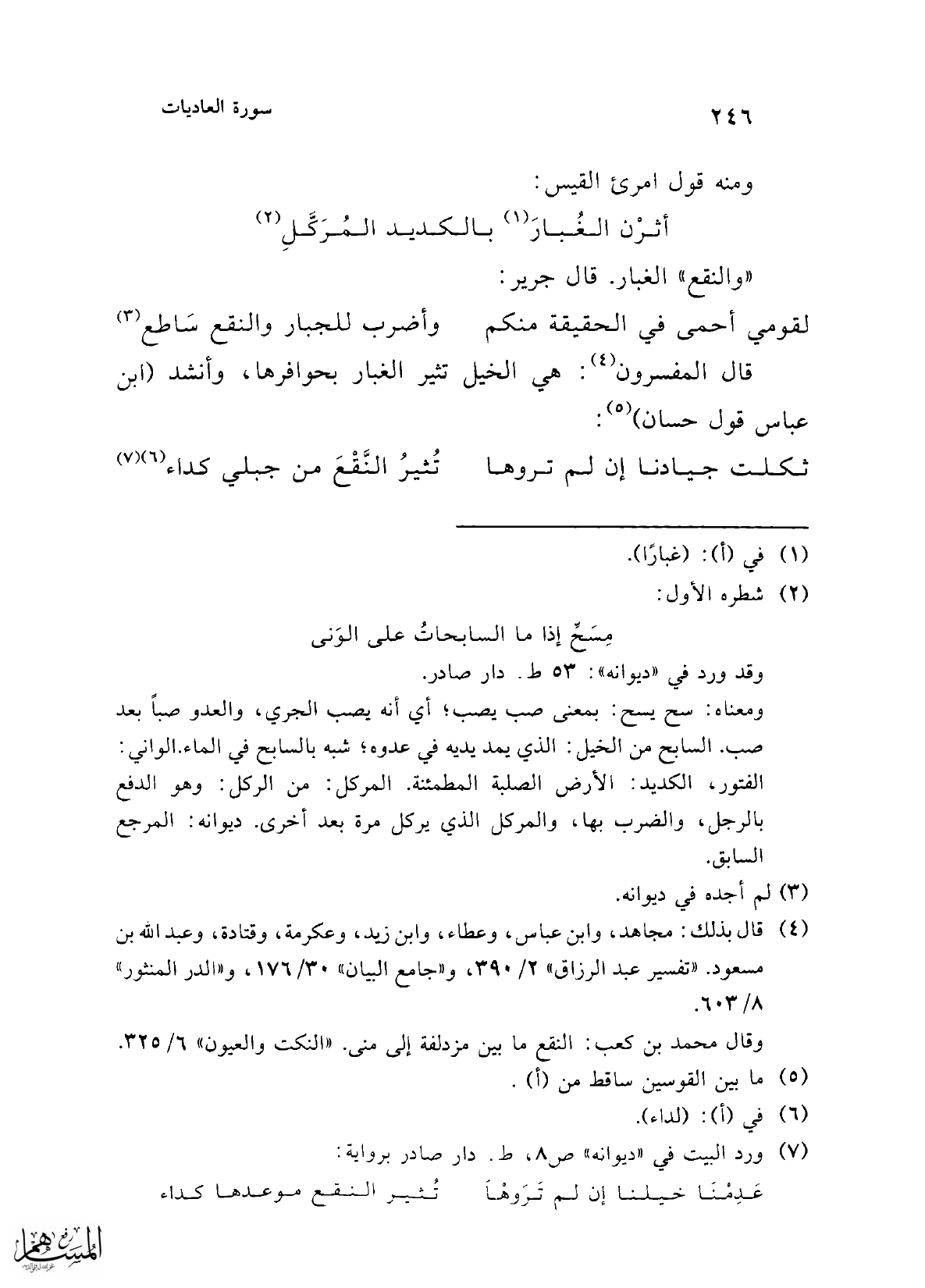 قال المفسرون (¬4): هي الخيل تثير الغبار بحوافرها، وأنشد (ابن عباس قول حسان) (¬5):