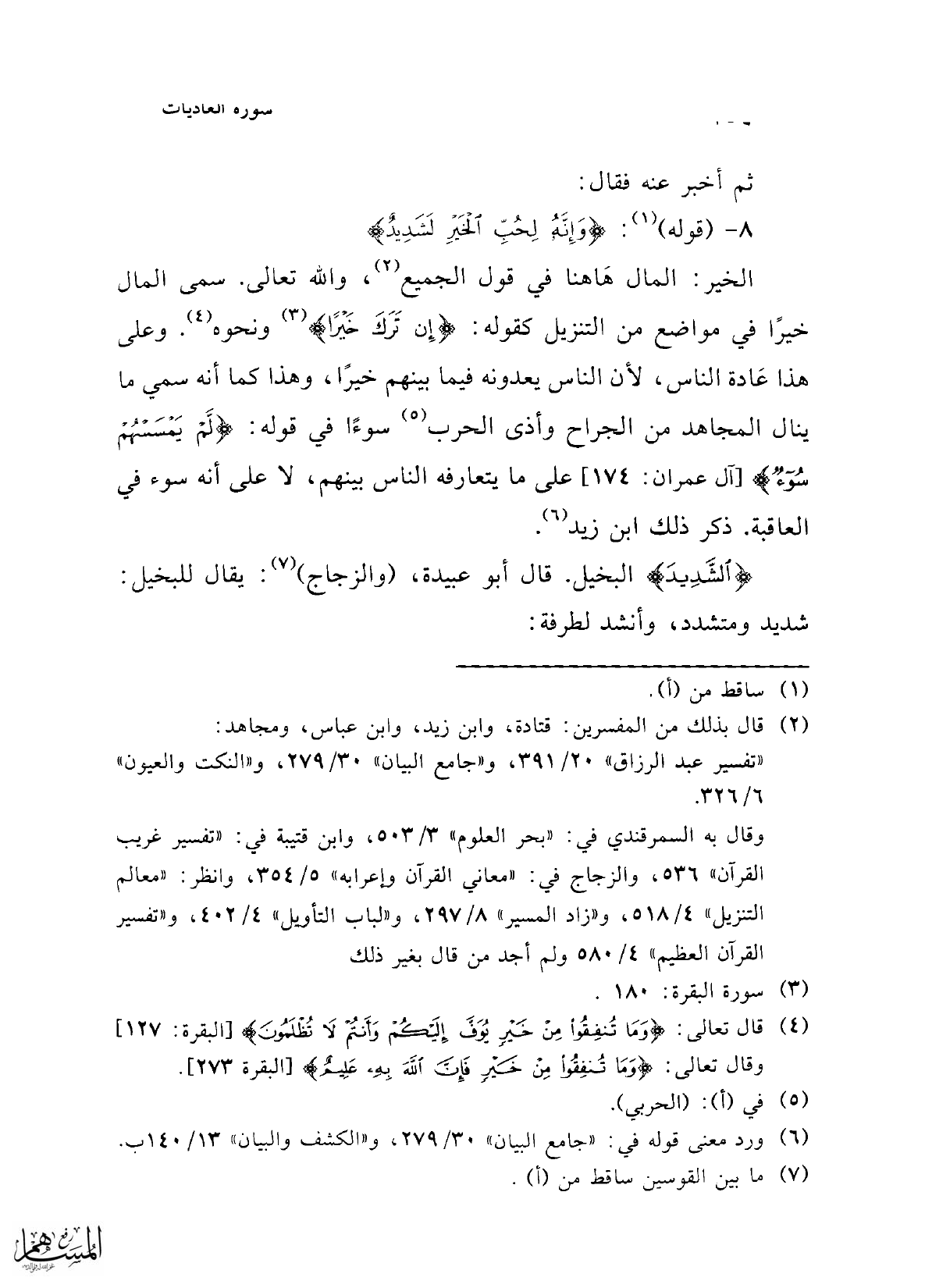 8 - (قوله) (¬1): {وَإِنَّهُ لِحُبِّ الْخَيْرِ لَشَدِيدٌ}
