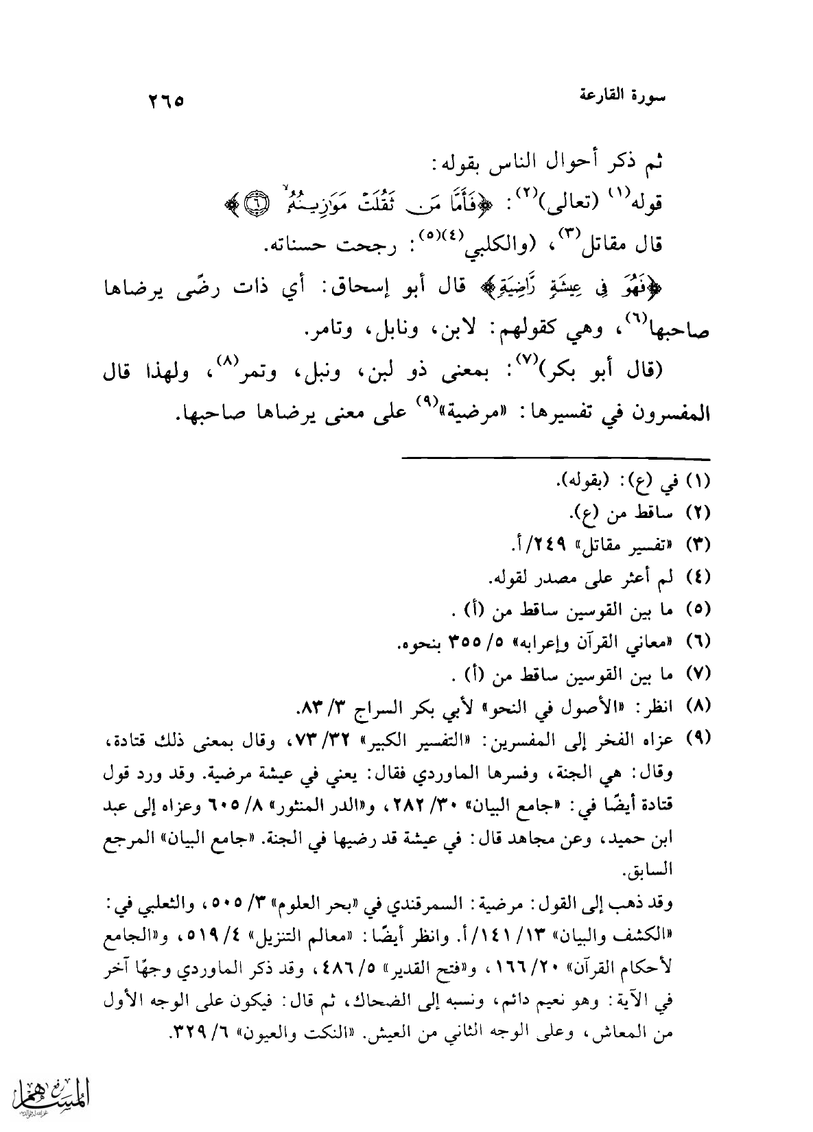 (¬9) عزاه الفخر إلى المفسرين: "التفسير الكبير" 32/ 73، وقال بمعنى ذلك قتادة، وقال: هي الجنة، وفسرها الماوردي فقال: يعني في عيشة مرضية. وقد ورد قول قتادة أيضًا في: "جامع البيان" 30/ 282، و"الدر المنثور" 8/ 605 وعزاه إلى عبد ابن حميد، وعن مجاهد قال: في عيشة قد رضيها في الجنة. "جامع البيان" المرجع السابق.