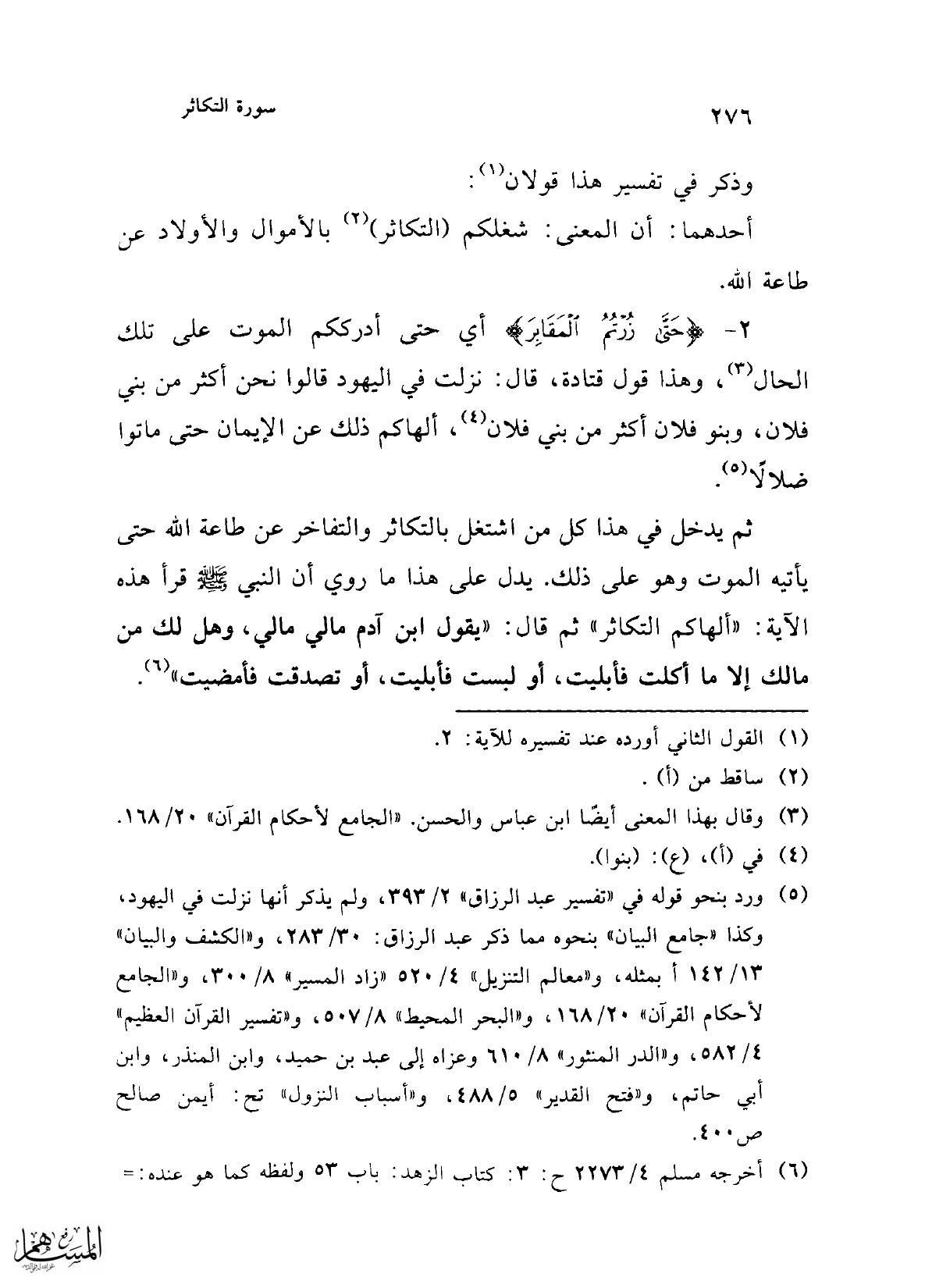 ثم يدخل في هذا كل من اشتغل بالتكاثر والتفاخر عن طاعة الله حتى يأتيه الموت وهو على ذلك. يدل على هذا ما روي أن النبي -صلى الله عليه وسلم- قرأ هذه الآية: "ألهاكم التكاثر" ثم قال: "يقول ابن آدم مالي مالي، وهل لك من مالك إلا ما أكلت فأبليت، أو لبست فأبليت، أو تصدقت فأمضيت" (¬6).