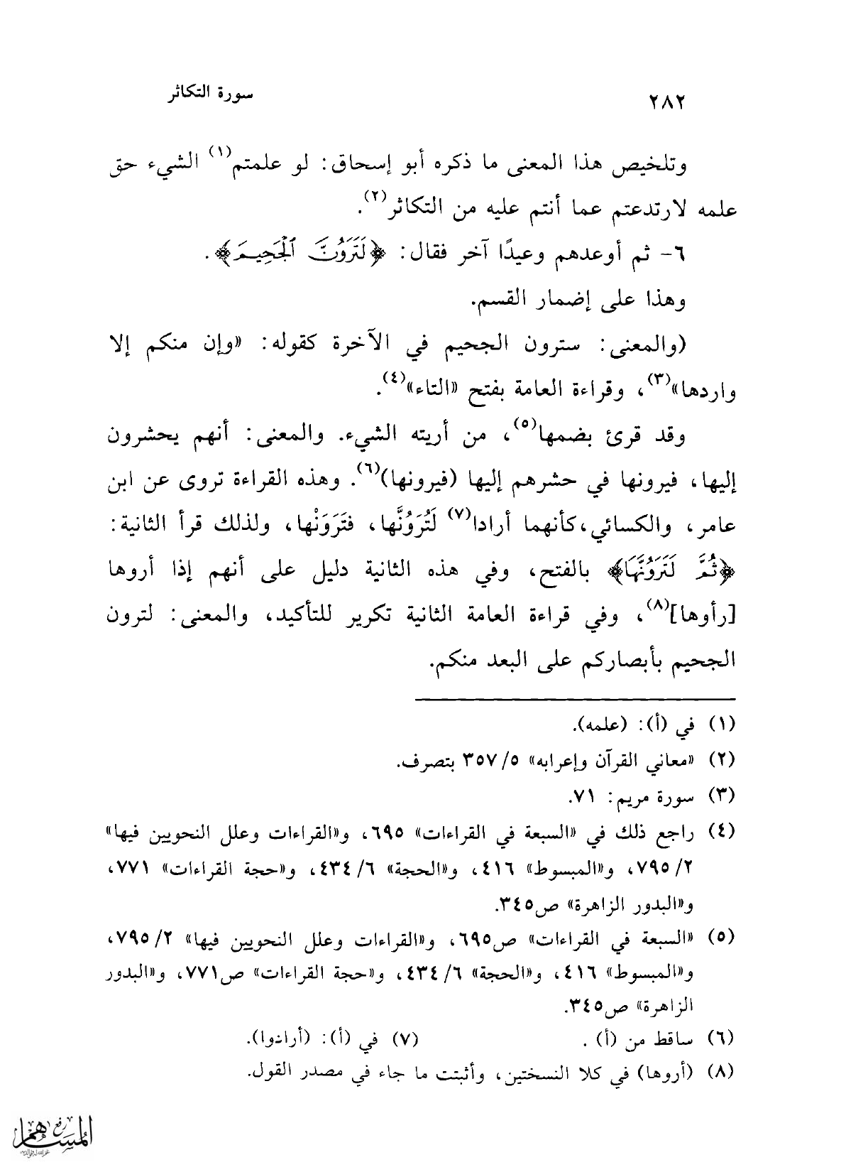 (والمعنى: سترون الجحيم في الآخرة كقوله: "وإن منكم إلا واردها" (¬3)، وقراءة العامة بفتح "التاء" (¬4). وقد قرئ بضمها (¬5)، من أريته الشيء. والمعنى: أنهم يحشرون إليها، فيرونها في حشرهم إليها (فيرونها) (¬6). وهذه القراءة تروى عن ابن عامر، والكسائي، كأنهما أرادا (¬7) لَتُرَوُنَّها، فتَرَوَنْها، ولذلك قرأ الثانية: {ثُمَّ لَتَرَوُنَّهَا} بالفتح، وفي هذه الثانية دليل على أنهم إذا أروها [رأوها] (¬8)، وفي قراءة العامة الثانية تكرير للتأكيد، والمعنى: لترون الجحيم بأبصاركم على البعد منكم.