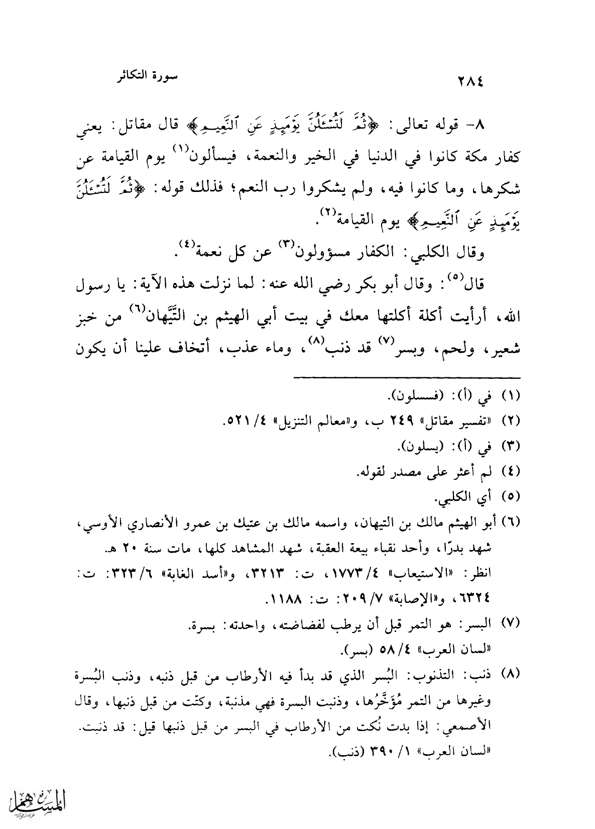 8 - قوله تعالى: {ثُمَّ لَتُسْأَلُنَّ يَوْمَئِذٍ عَنِ النَّعِيمِ} قال مقاتل: يعني كفار مكة كانوا في الدنيا في الخير والنعمة، فيسألون (¬1) يوم القيامة عن شكرها، وما كانوا فيه، ولم يشكروا رب النعم؛ فذلك قوله: {ثُمَّ لَتُسْأَلُنَّ يَوْمَئِذٍ عَنِ النَّعِيمِ} يوم القيامة (¬2).