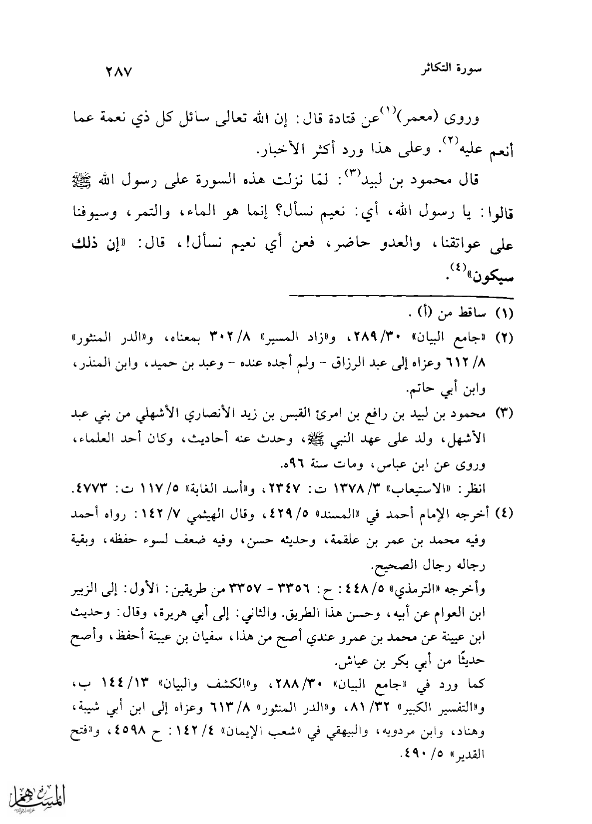 قال محمود بن لبيد (¬3): لمّا نزلت هذه السورة علي رسول الله -صلى الله عليه وسلم- قالوا: يا رسول الله، أي: نعيم نسأل؟ إنما هو الماء، والتمر، وسيوفنا علي عواتقنا، والعدو حاضر، فعن أي نعيم نسأل!، قال: "إن ذلك سيكون" (¬4).