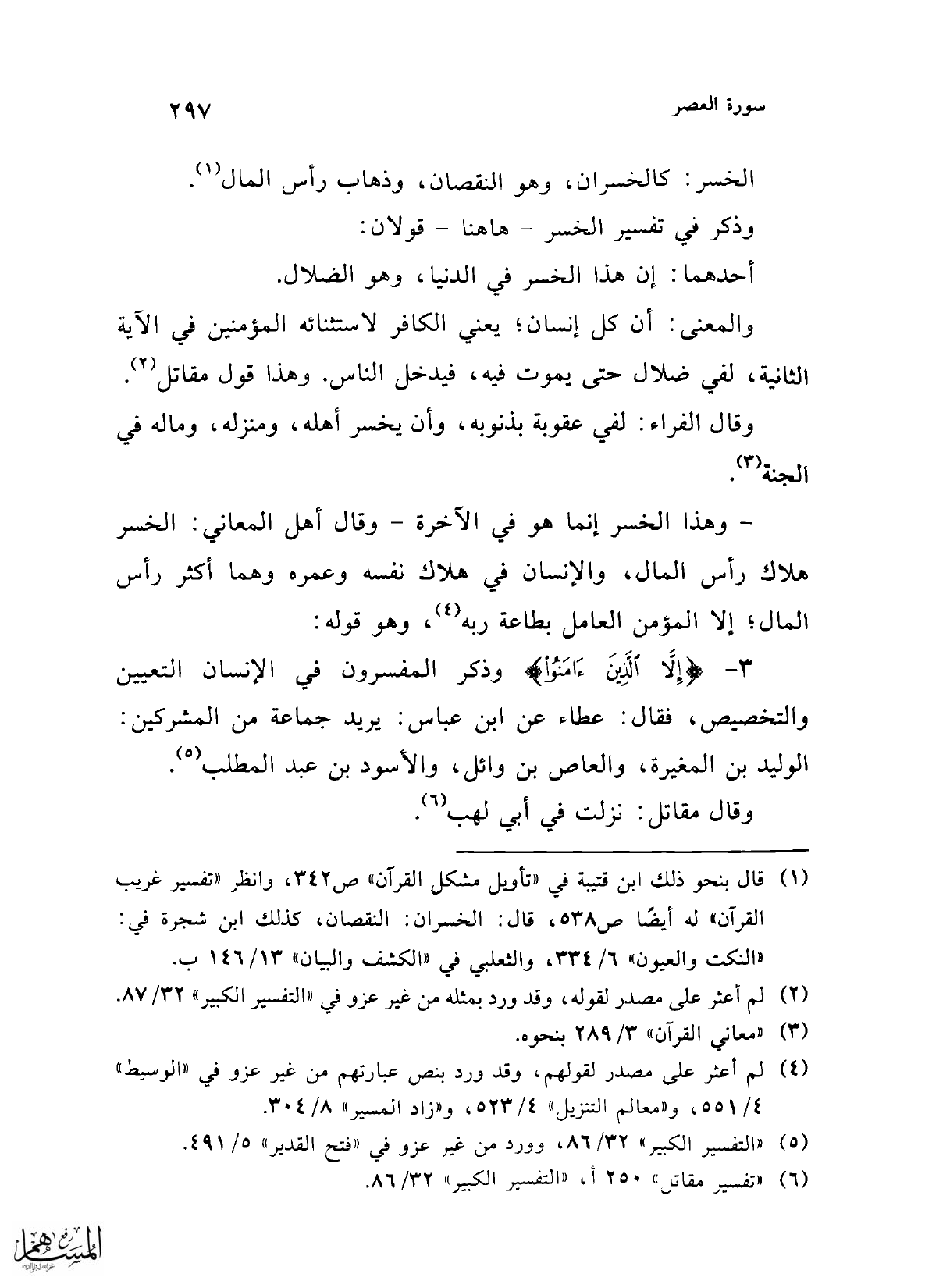 (¬1) قال بنحو ذلك ابن قتيبة في "تأويل مشكل القرآن" ص 342، وانظر "تفسير غريب القرآن" له أيضًا ص 538، قال: الخسران: النقصان، كذلك ابن شجرة في: "النكت والعيون" 6/ 334، والثعلبي في "الكشف والبيان" 13/ 146 ب.