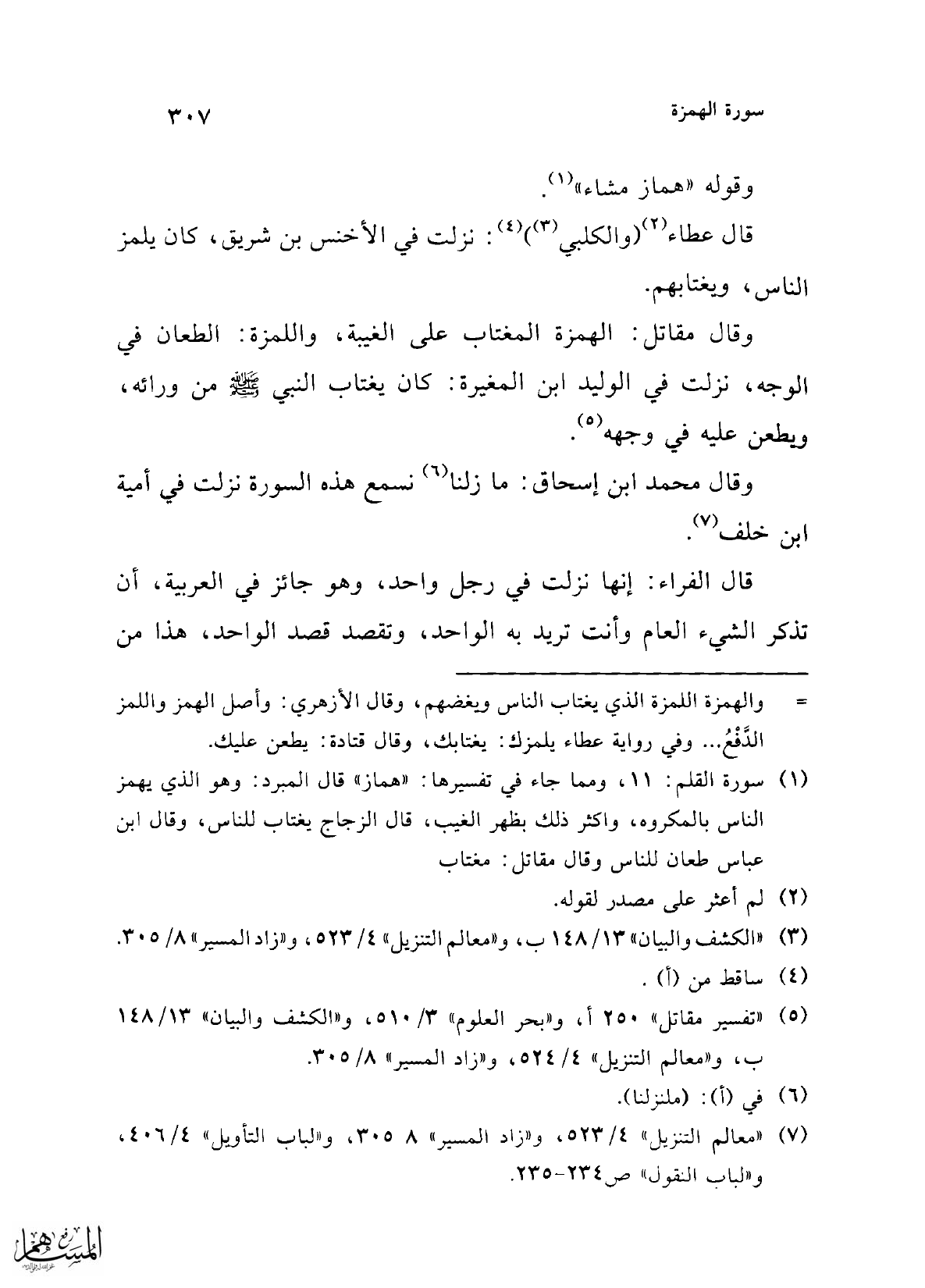 (¬1) سورة القلم: 11، ومما جاء في تفسيرها: "هماز" قال المبرد: وهو الذي يهمز الناس بالمكروه، وأكثر ذلك بظهر الغيب، قال الزجاج يغتاب للناس، وقال ابن عباس طعان للناس وقال مقاتل: مغتاب.