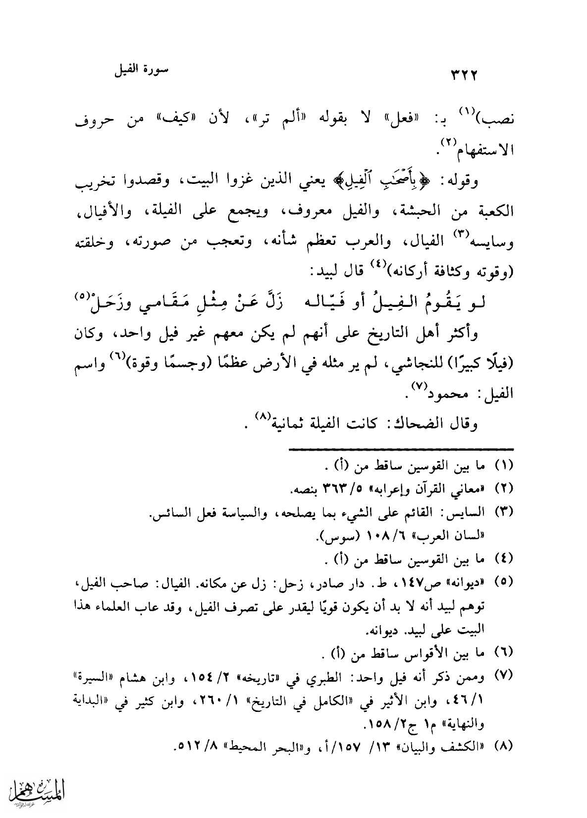 وقوله: {بِأَصْحَابِ الْفِيلِ} يعني الذين غزوا البيت، وقصدوا تخريب الكعبة من الحبشة، والفيل معروف، ويجمع على الفيلة، والأفيال، وسايسه (¬3) الفيال، والعرب تعظم شأنه، وتعجب من صورته، وخلقته (وقوته وكثافة أركانه) (¬4) قال لبيد: