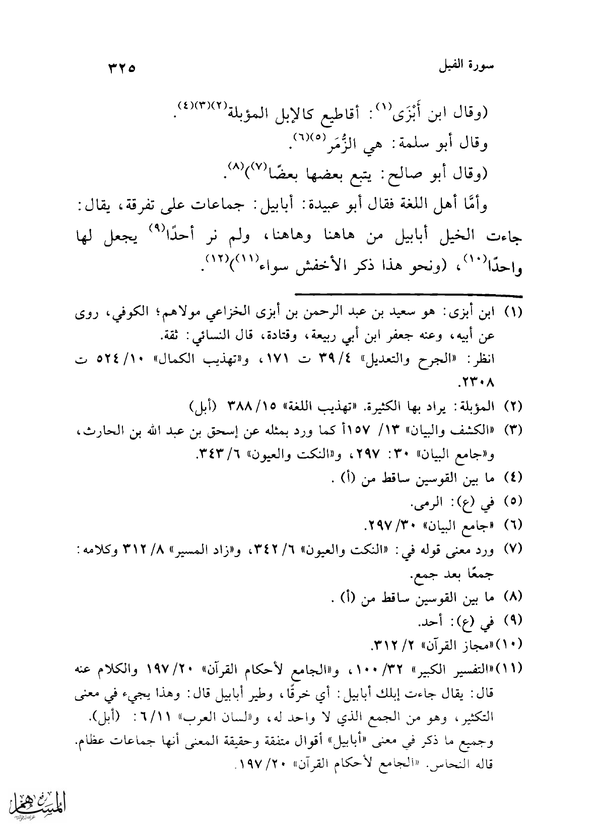 (¬11) "التفسير الكبير" 32/ 100، و"الجامع لأحكام القرآن" 20/ 197 والكلام عنه قال: يقال جاءت إبلك أبابيل: أي خرقًا، وطير أبابيل قال: وهذا يجيء في معنى التكثير، وهو من الجمع الذي لا واحد له، و"لسان العرب" 6/ 11: (أبل). وجميع ما ذكر في معنى "أبابيل" أقوال متفقة وحقيقة المعنى أنها جماعات عظام. قاله النحاس. "الجامع لأحكام القرآن" 20/ 197.