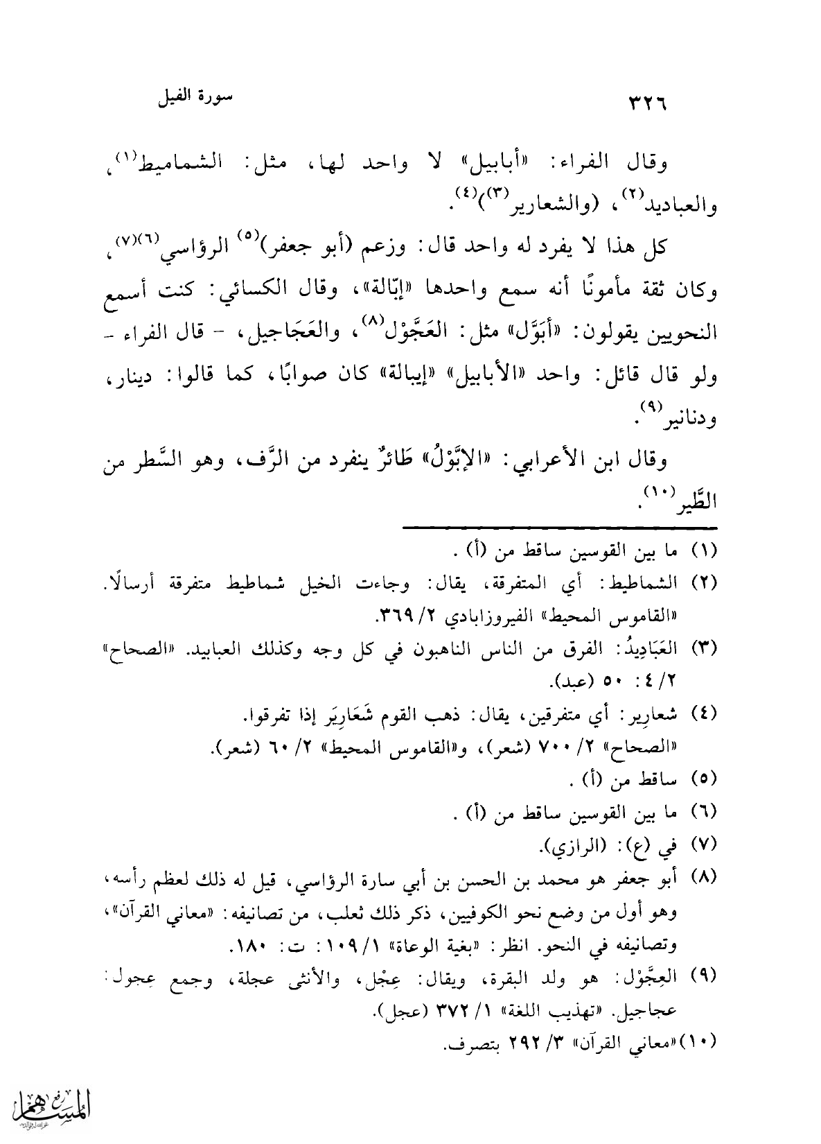 كل هذا لا يفرد له واحد قال: وزعم (أبو جعفر) (¬5) الرؤاسي (¬6) (¬7)، وكان ثقة مأمونًا أنه سمع واحدها "إبالة"، وقال الكسائي: كنت أسمع النحويين يقولون: "أبَوَّل" مثل: العَجَّوْل (¬8)، والعَجَاجيل، -قال الفراء- ولو قال قائل: واحد "الأبابيل" "إيبالة" كان صوابًا، كما قالوا: دينار، ودنانير (¬9).