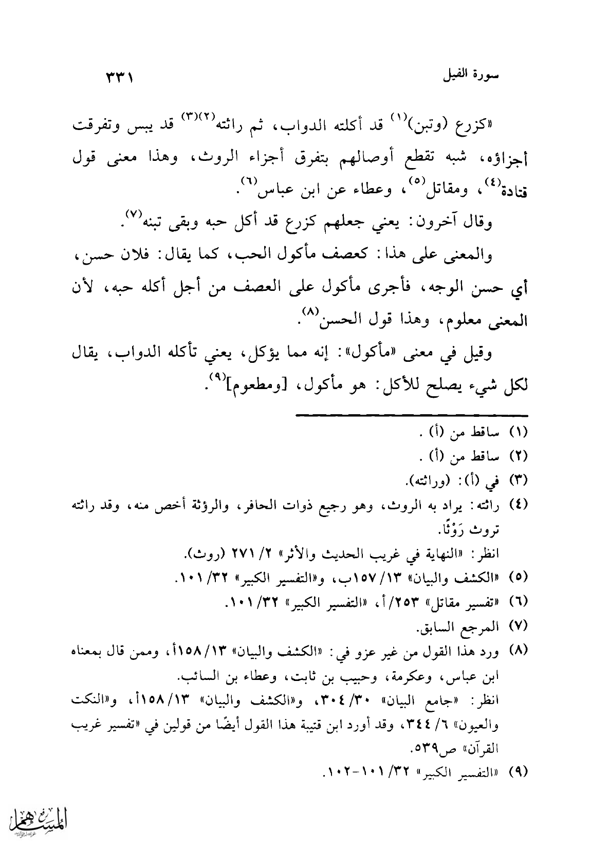 والمعنى على هذا: كعصف مأكول الحب، كما يقال: فلان حسن، أي حسن الوجه، فأجرى مأكول على العصف من أجل أكله حبه، لأن المعني معلوم، وهذا قول الحسن (¬8).