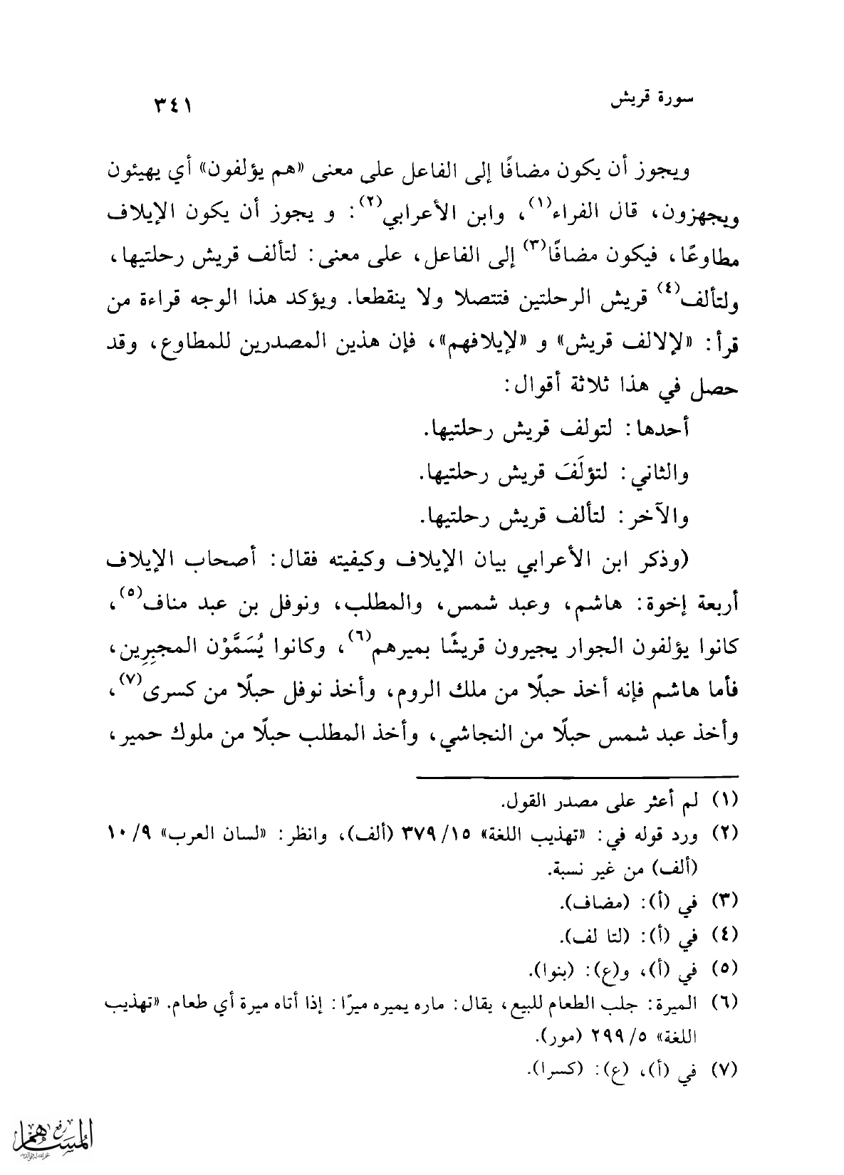 ويجوز أن يكون مضافًا إلى الفاعل على معنى "هم يؤلفون" أي يهيئون ويجهزون، قال الفراء (¬1)، وابن الأعرابي (¬2): ويجوز أن يكون الإيلاف مطاوعًا، فيكون مضافاً (¬3) إلى الفاعل، على معنى: لتألف قريش رحلتيها، ولتألف (¬4) قريش الرحلتين فتتصلا ولا ينقطعا. ويؤكد هذا الوجه قراءة من قرأ: "لإلالف قريش" و"لإيلافهم"، فإن هذين المصدرين للمطاوع، وقد حصل في هذا ثلاثة أقوال: