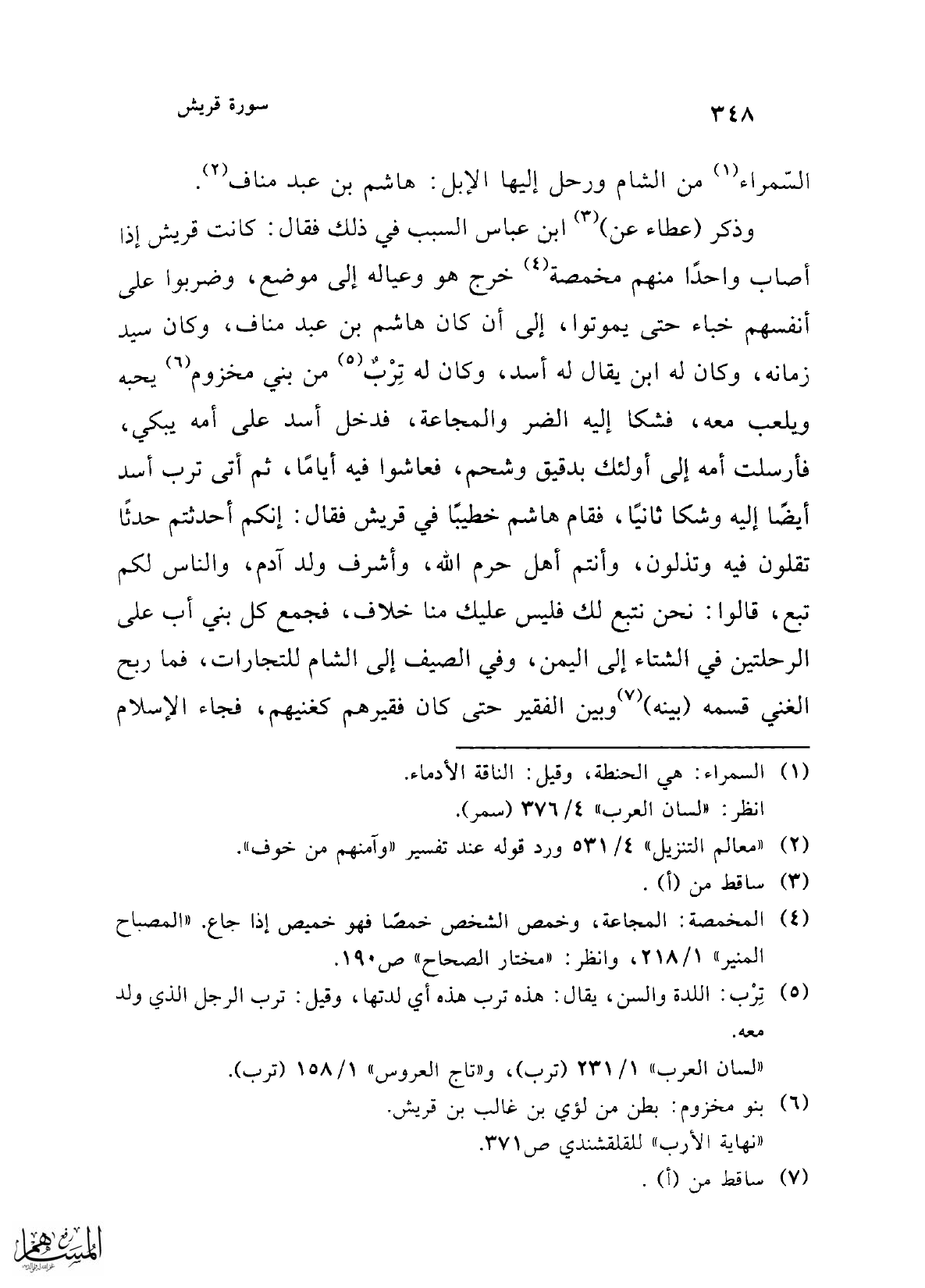 وذكر (عطاء عن) (¬3) ابن عباس السبب في ذلك فقال: كانت قريش إذا أصاب واحداً منهم مخمصة (¬4) خرج هو وعياله إلى موضع، وضربوا علي أنفسهم خباء حتى يموتوا، إلى أن كان هاشم بن عبد مناف، وكان سيد زمانه، وكان له ابن يقال له أسد، وكان له تِرْبٌ (¬5) من بني مخزوم (¬6) يحبه ويلعب معه، فشكا إليه الضر والمجاعة، فدخل أسد على أمه يبكي، فأرسلت أمه إلى أولئك بدقيق وشحم، فعاشوا فيه أيامًا، ثم أتى ترب أسد أيضًا إليه وشكا ثانيًا، فقام هاشم خطيبًا في قريش فقال: إنكم أحدثتم حدثًا تقلون فيه وتذلون، وأنتم أهل حرم الله، وأشرف ولد آدم، والناس لكم تبع، قالوا: نحن نتبع لك فليس عليك منا خلاف، فجمع كل بني أب على الرحلتين في الشتاء إلى اليمن، وفي الصيف إلى الشام للتجارات، فما ربح الغني قسمه (بينه) (¬7) وبين الفقير حتى كان فقيرهم كغنيهم، فجاء الإسلام