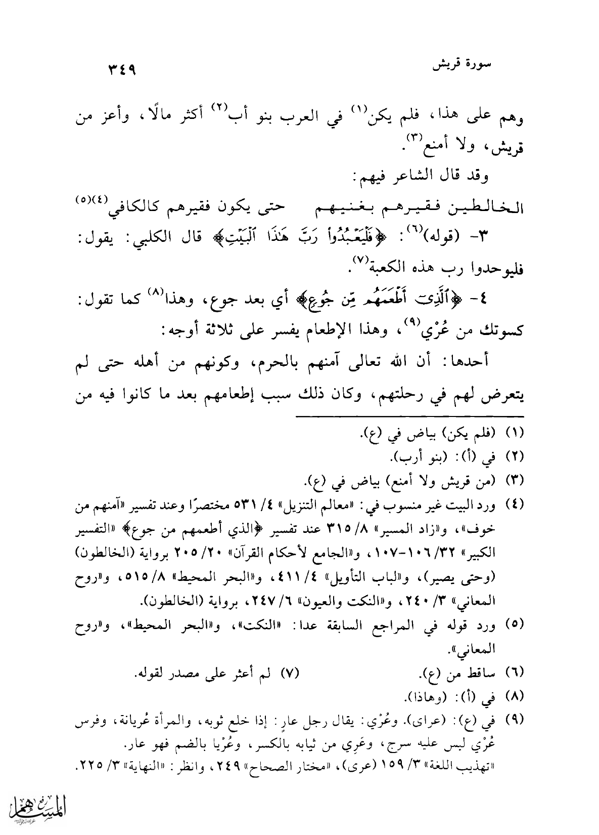 (¬4) ورد البيت غير منسوب في: "معالم التنزيل" 4/ 531 مختصرًا وعند تفسير "آمنهم من خوف"، و"زاد المسير" 8/ 315 عند تفسير {الَّذِي أَطْعَمَهُمْ مِنْ جُوعٍ} "التفسير الكبير" 32/ 106 - 107، و"الجامع لأحكام القرآن" 20/ 205 برواية (الخالطون) (وحتى يصير)، و"لباب التأويل" 4/ 411، و"البحر المحيط" 8/ 515، و"روح المعاني" 3/ 240، و"النكت والعيون" 6/ 247، برواية (الخالطون).