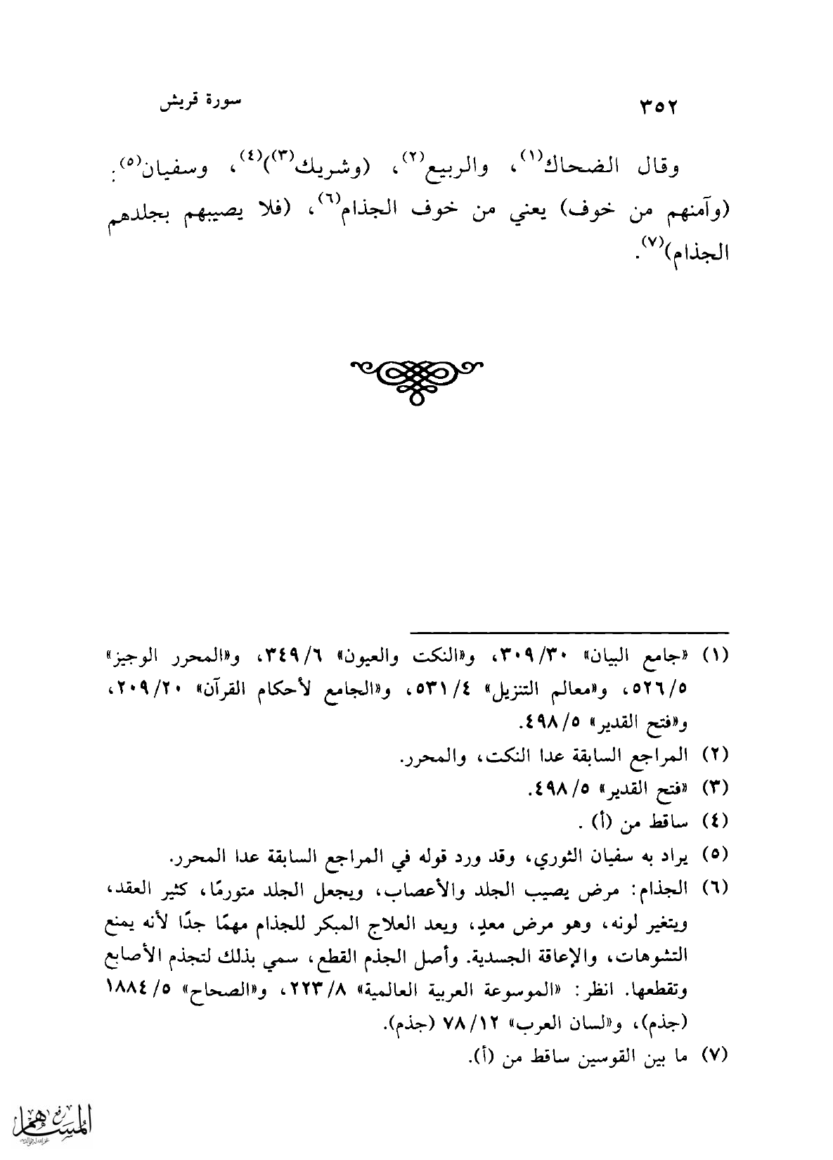 (¬6) الجذام: مرض يصيب الجلد والأعصاب، ويجعل الجلد متورمًا، كثير العقد، ويتغير لونه، وهو مرض معدٍ، ويعد العلاج المبكر للجذام مهمًا جدًا لأنه يمنع التشوهات، والإعاقة الجسدية. وأصل الجذم القطع، سمي بذلك لتجذم الأصابع وتقطعها. انظر: "الموسوعة العربية العالمية" 8/ 223، و"الصحاح" 5/ 1884 (جذم)، و"لسان العرب" 12/ 78 (جذم).