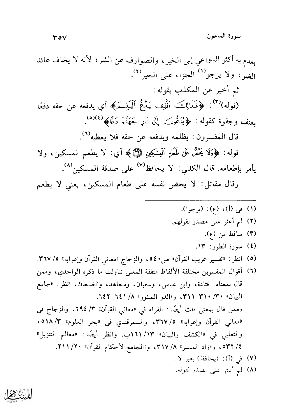 قوله: {وَلَا يَحُضُّ عَلَى طَعَامِ الْمِسْكِينِ (3)} أي: لا يطعم المسكين، ولا يأمر بإطعامه. قال الكلبي: لا يحافظ (¬7) على صدقة المسكين (¬8).