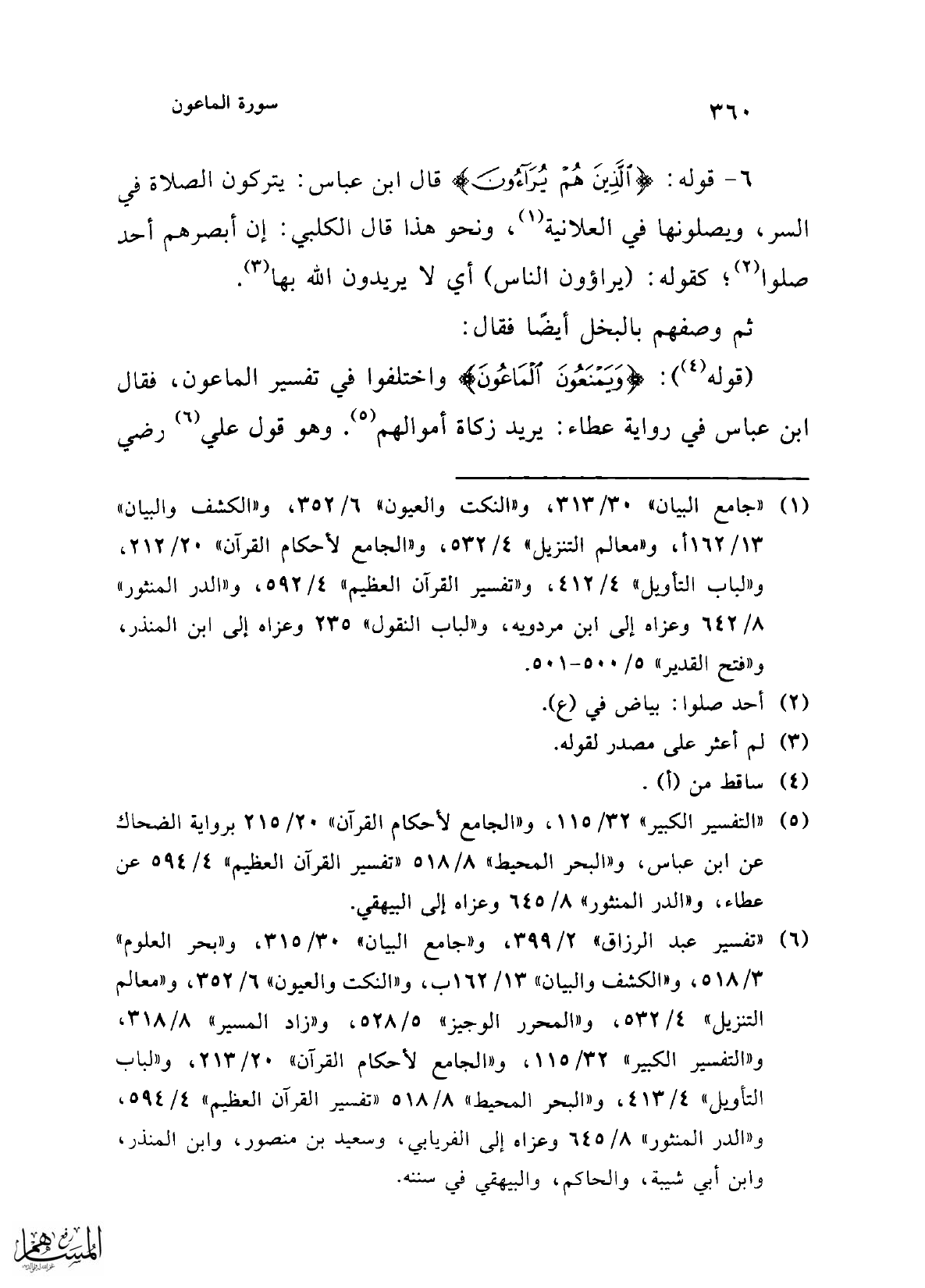 (قوله (¬4)): {وَيَمْنَعُونَ الْمَاعُونَ} واختلفوا في تفسير الماعون، فقال ابن عباس في رواية عطاء: يريد زكاة أموالهم (¬5). وهو قول علي (¬6) رضي