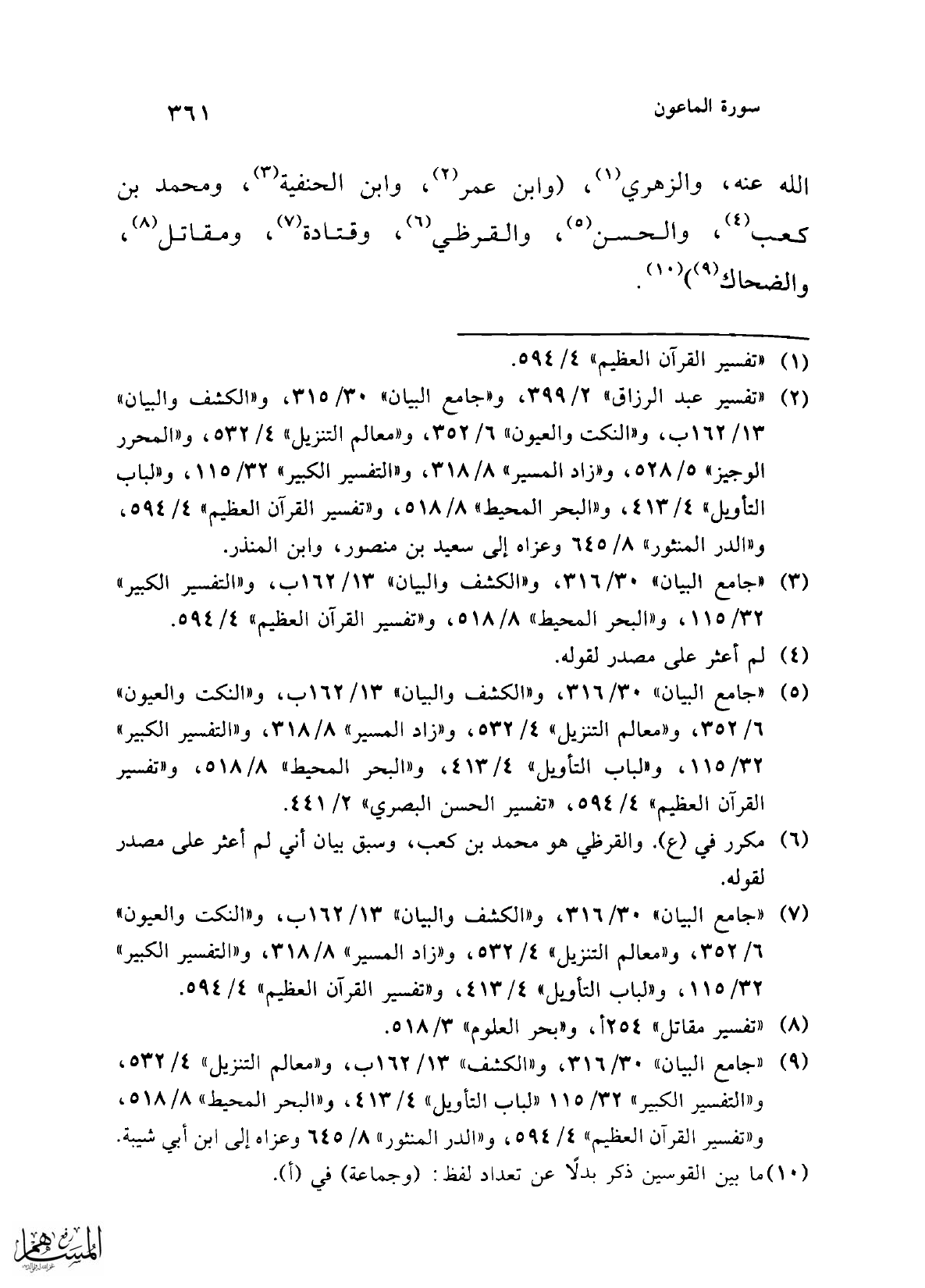 (¬9) "جامع البيان" 30/ 316، و"الكشف" 13/ 162 ب، و"معالم التنزيل" 4/ 532، و"التفسير الكبير" 32/ 115 "لباب التأويل" 4/ 413، و"البحر المحيط" 8/ 518، و"تفسير القرآن العظيم" 4/ 594، و"الدر المنثور" 8/ 645 وعزاه إلى ابن أبي شيبة.