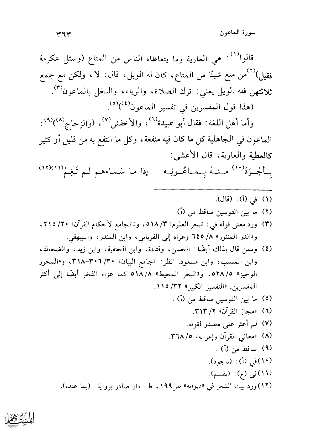وأما أهل اللغة: فقال أبو عبيدة (¬6)، والأخفش (¬7)، (والزجاج (¬8)) (¬9): الماعون في الجاهلية كل ما كان فيه منفعة، وكل ما انتفع به من قليل أو كثير كالعطية والعارية، قال الأعشى: