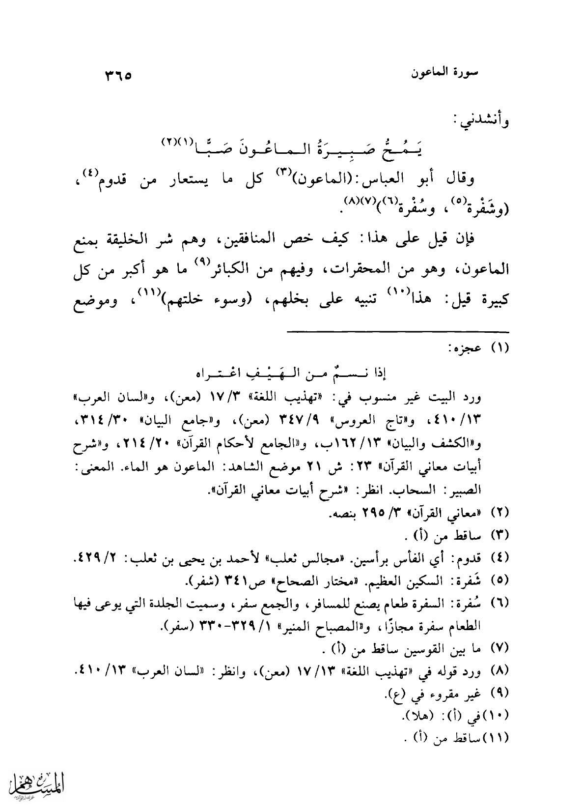 ورد البيت غير منسوب في: "تهذيب اللغة" 3/ 17 (معن)، و"لسان العرب" 13/ 410، و"تاج العروس" 9/ 347 (معن)، و"جامع البيان" 30/ 314، و"الكشف والبيان" 13/ 162 ب، و"الجامع لأحكام القرآن" 20/ 214، و"شرح أبيات معاني القرآن" 23: ش 21 موضع الشاهد: الماعون هو الماء. المعنى: الصبير: السحاب. انظر: "شرح أبيات معاني القرآن".