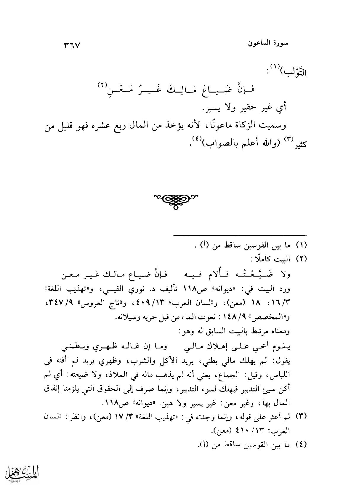 وسميت الزكاة ماعونًا، لأنه يؤخذ من المال ربع عشره فهو قليل من كثير (¬3) (والله أعلم بالصواب) (¬4).