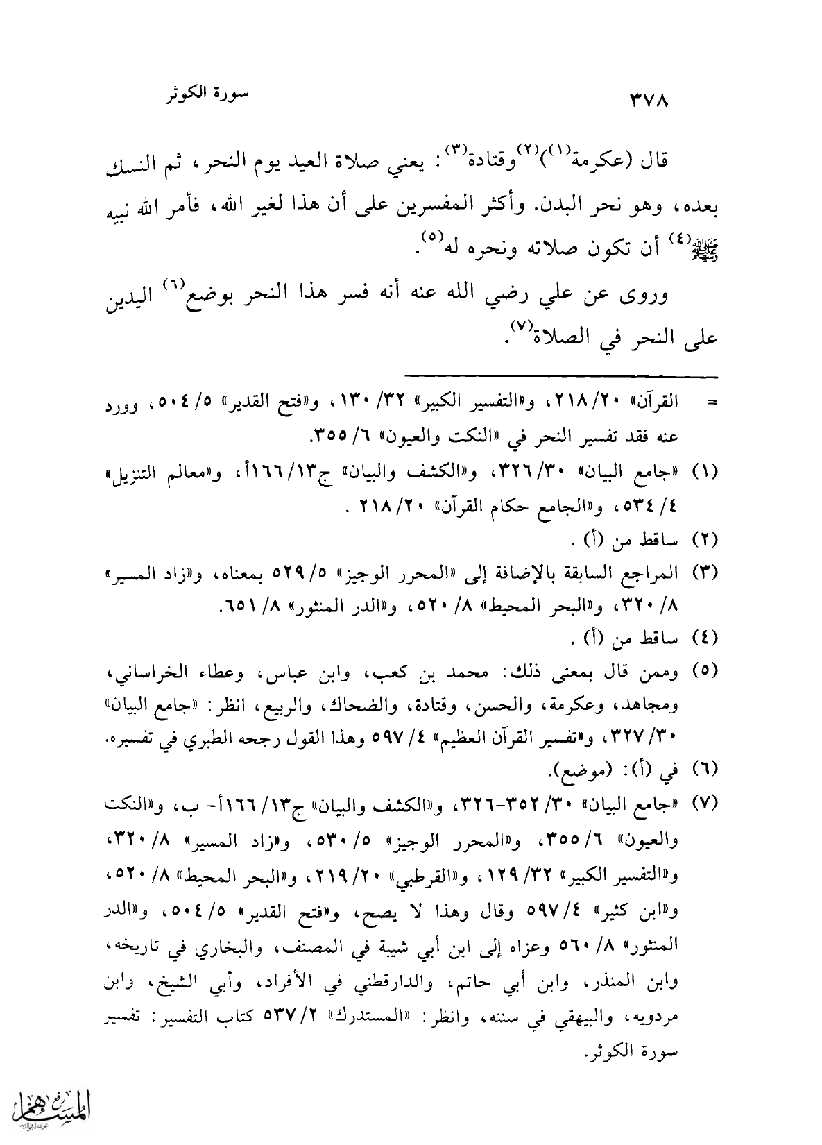 = القرآن" 20/ 218، و"التفسير الكبير" 32/ 130، و"فتح القدير" 5/ 504، وورد عنه فقد تفسير النحر في "النكت والعيون" 6/ 355.