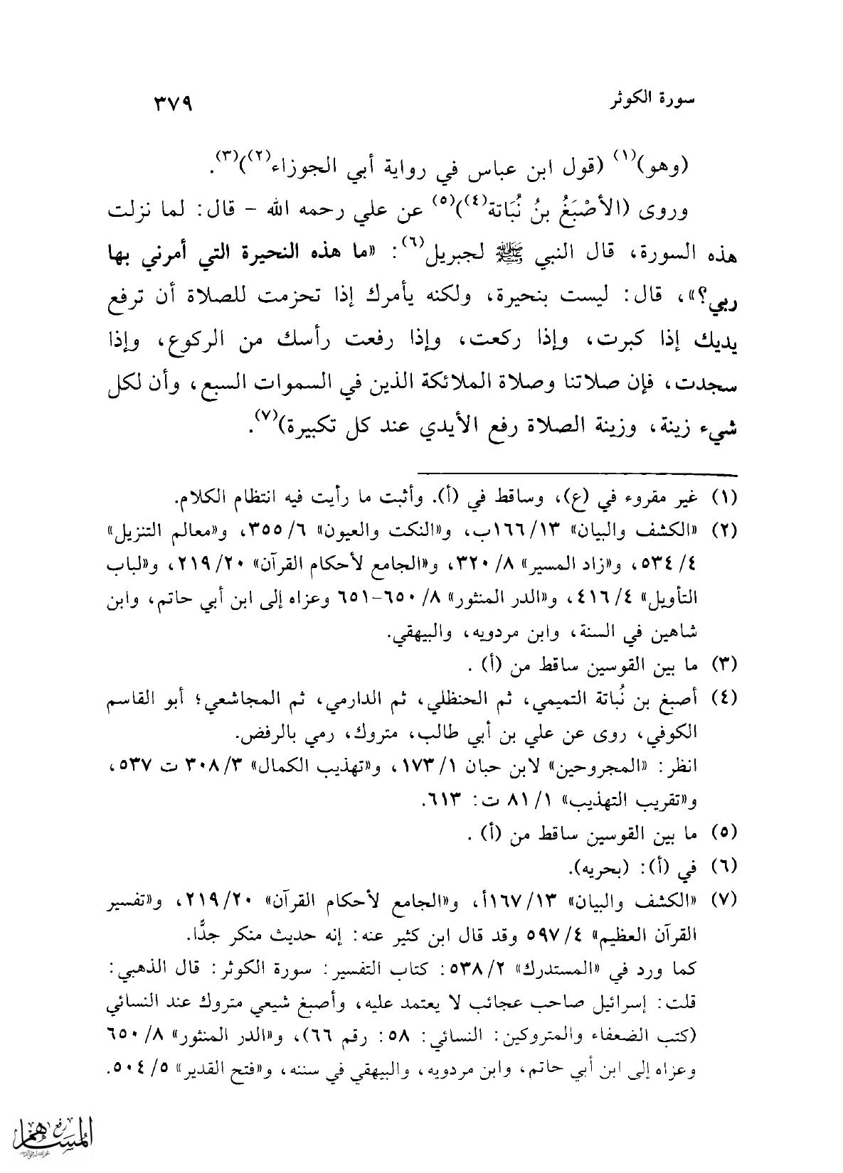 وروى (الأصْبَغُ بنُ نُبَاتة (¬4)) (¬5) عن علي رحمه الله - قال: لما نزلت هذه السورة، قال النبي -صلى الله عليه وسلم- لجبريل (¬6): "ما هذه النحيرة التي أمرني بها ربي؟ "، قال: ليست بنحيرة، ولكنه يأمرك إذا تحزمت للصلاة أن ترفع يديك إذا كبرت، وإذا ركعت، وإذا رفعت رأسك من الركوع، وإذا سجدت، فإن صلاتنا وصلاة الملائكة الذين في السموات السبع، وأن لكل شيء زينة، وزينة الصلاة رفع الأيدي عند كل تكبيرة) (¬7).