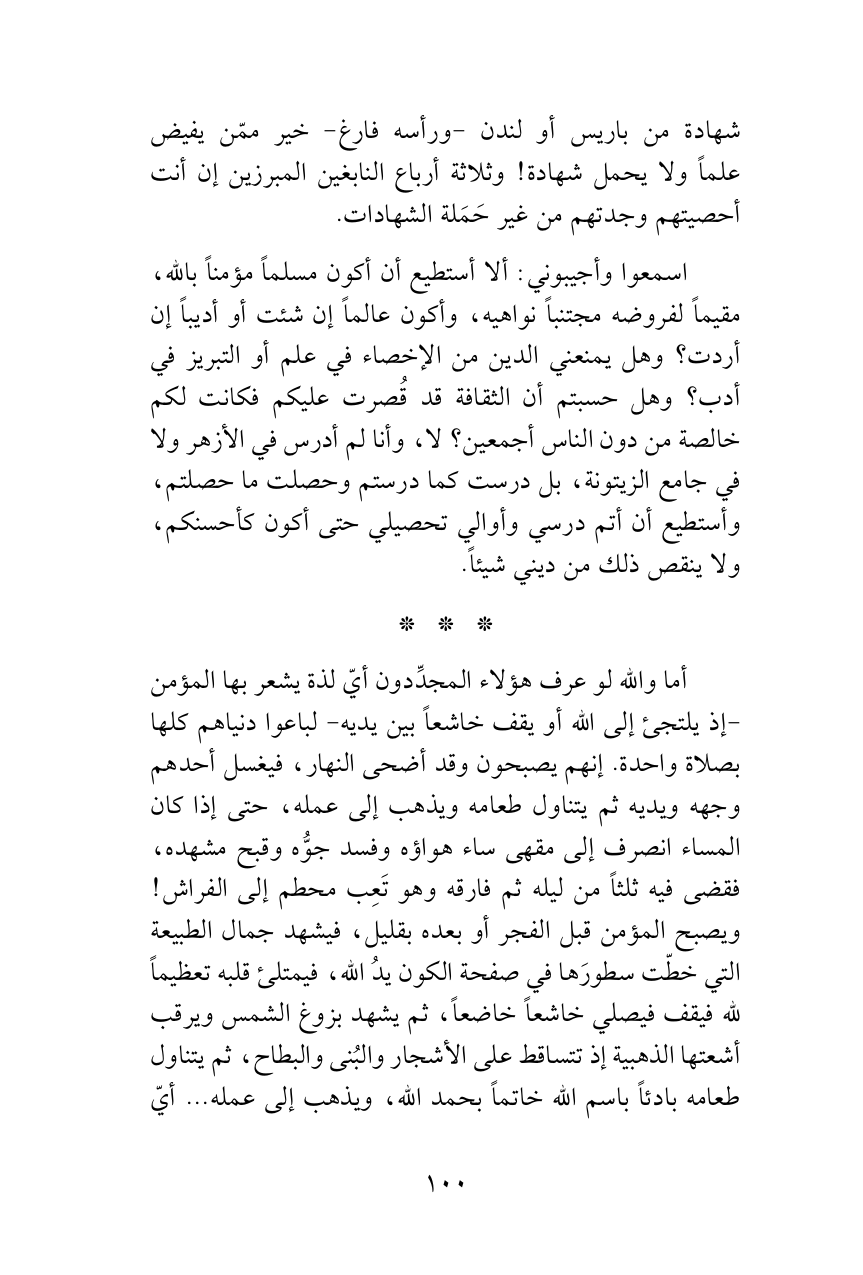 اسمعوا وأجيبوني: ألا أستطيع أن أكون مسلماً مؤمناً بالله، مقيماً لفروضه مجتنباً نواهيه، وأكون عالماً إن شئت أو أديباً إن أردت؟ وهل يمنعني الدين من الإخصاء في علم أو التبريز في أدب؟ وهل حسبتم أن الثقافة قد قُصرت عليكم فكانت لكم خالصة من دون الناس أجمعين؟ لا، وأنا لم أدرس في الأزهر ولا في جامع الزيتونة، بل درست كما درستم وحصلت ما حصلتم، وأستطيع أن أتم درسي وأوالي تحصيلي حتى أكون كأحسنكم، ولا ينقص ذلك من ديني شيئاً.